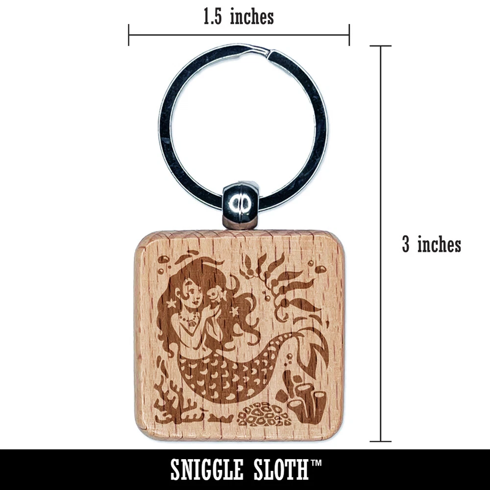 Mermaid Swimming in Reef Engraved Wood Square Keychain Tag Charm