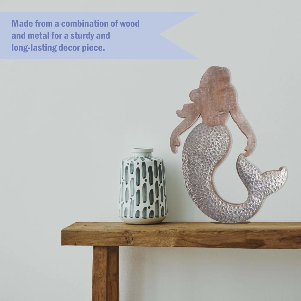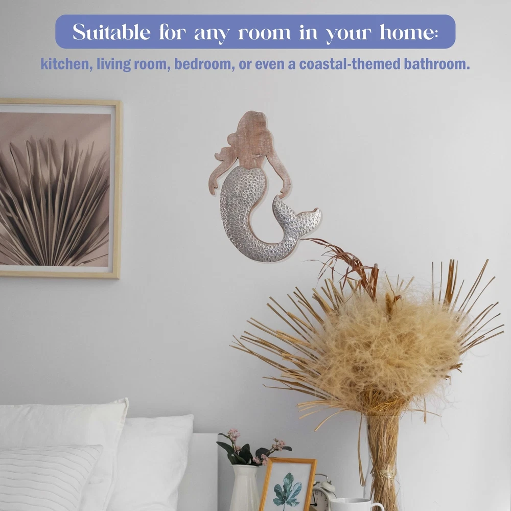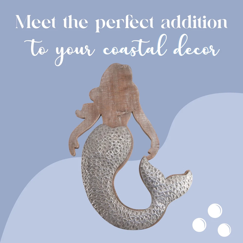 "Bring a coastal, yet chic look to your home with the Metal and Wood Mermaid Wall Decor. This exquisite piece features a wooden mermaid with elegant metal details on the tail, crafted to bring a nautical charm to your space. The neutral tones of the mermaid wall decor ensure it blends seamlessly with any wall color, making it a versatile addition to various decor styles, including modern, rustic, and nautical-themed interiors. Ideal for enhancing the decor of kitchens, living rooms, bedrooms, and beach houses, this mermaid wall decor serves as a stunning focal point. It is easy to hang with a built-in hook, allowing for quick and hassle-free installation. Embrace the beauty of the coast with this unique mermaid wall art, perfect for coastal homes and ocean-inspired interiors. like wall hangings, metal wall art, and gallery walls not only enhance the aesthetic appeal of a space but also make it feel more inviting and lived-in. This mermaid wall decor, with its coastal and nautical theme, adds a touch of and charm, making any room feel like a cozy retreat. Perfect for personalizing your space, wall decor helps in setting the tone of your home, creating an inviting and comfortable atmosphere for family and guests alike."