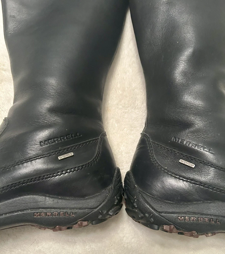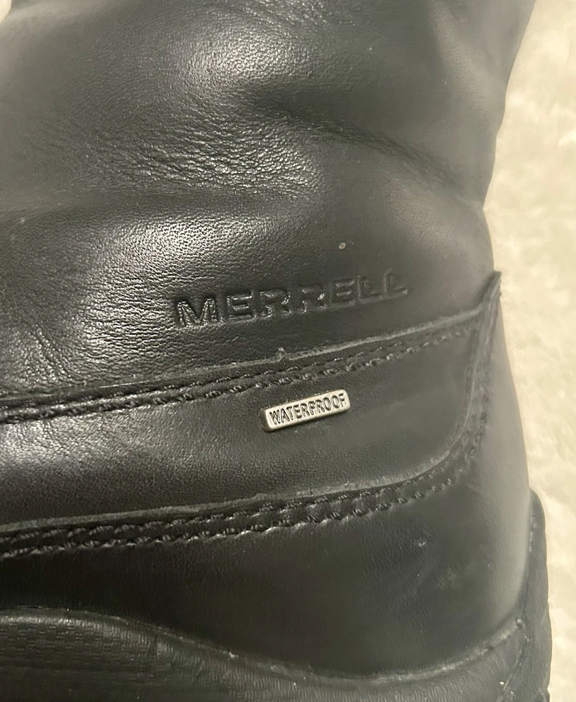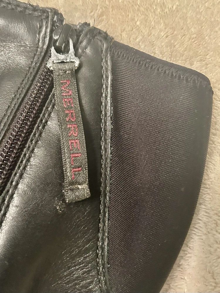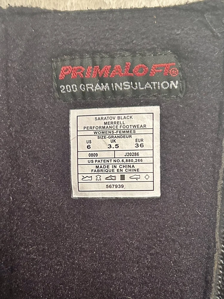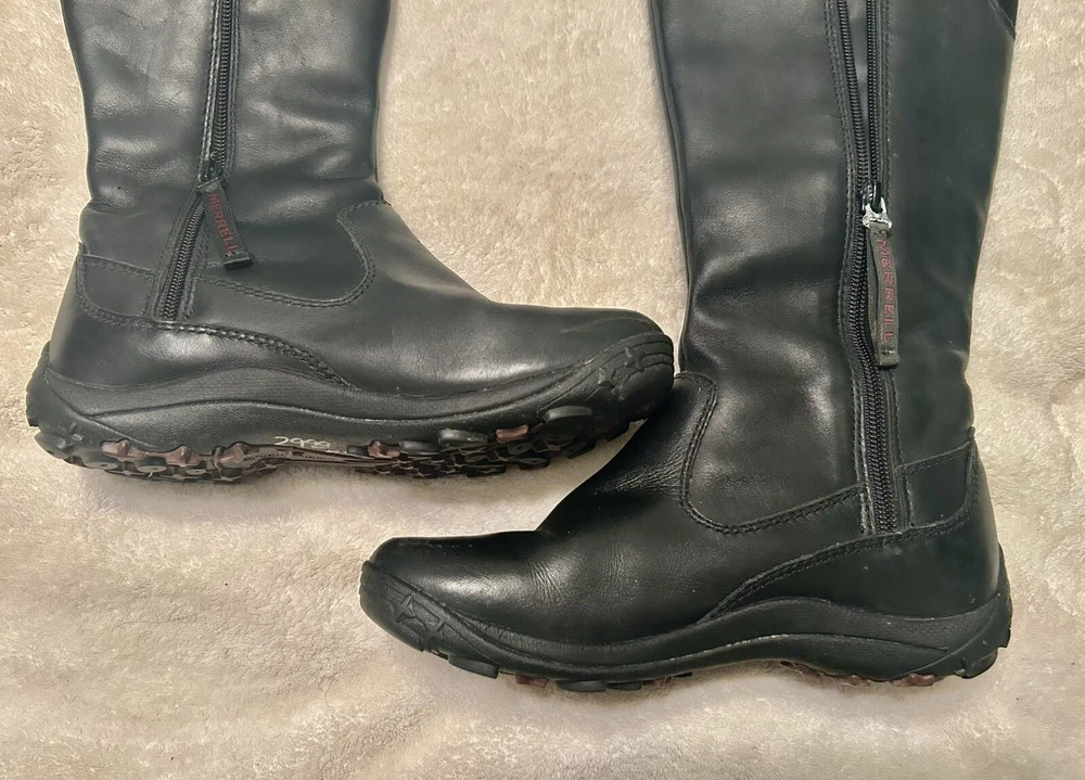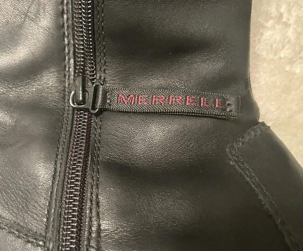 Seratov Black Merrell Knee High Boots Primaloft 200 gm Insulation Waterproof Polartic Zippered Elastic Calf Top Women’s Size 6 Previously Owned Light Wear Needs inserts One zipper pull has corrosion In good usable condition See photos for details and condition