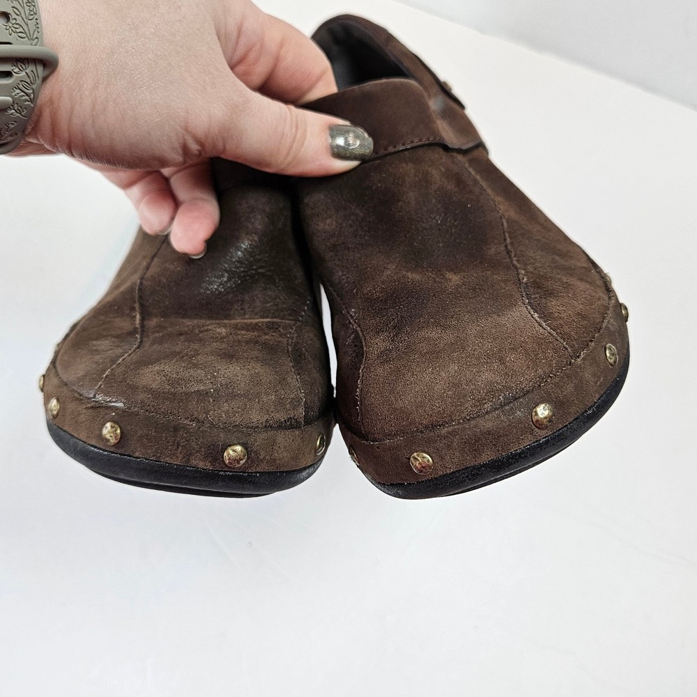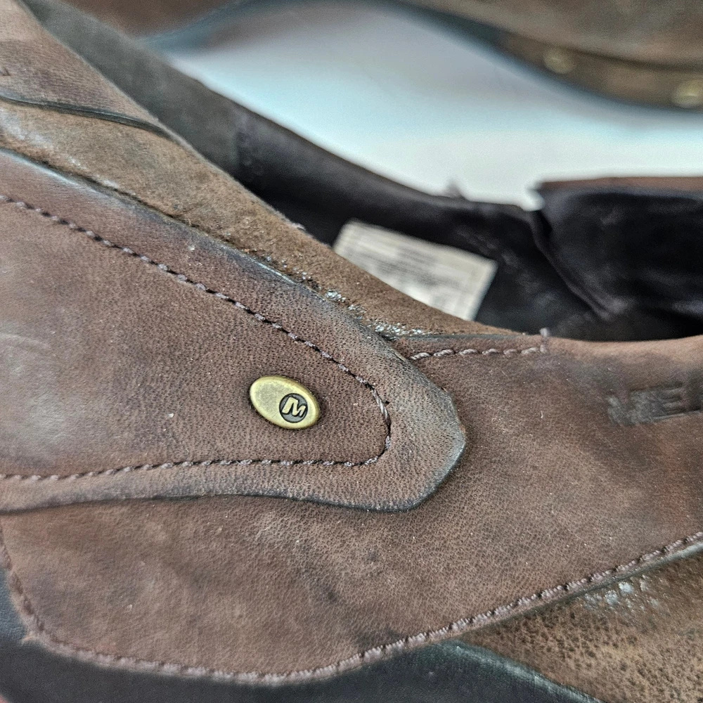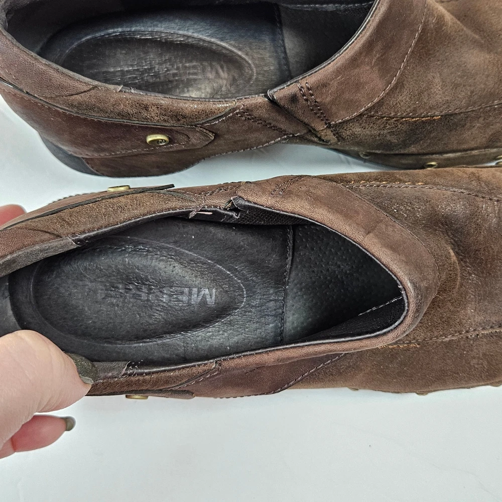 Merrell Luxe Wrap Espresso Brown Leather Clogs Studded J68680 Women 8 Slip on Rubber heel Clog Studded detail Uppers: Leather Balance: Manmade j68680 Women's 8 UK 5.5 EUR 38.5 Heel is about 2" casual everyday comfort unique business professional aesthetic edgy walking neutral cottage cabin outdoor earth tone Excellent pre-owned condition, no rips, tears or stains. Smoke free, dog friendly home.