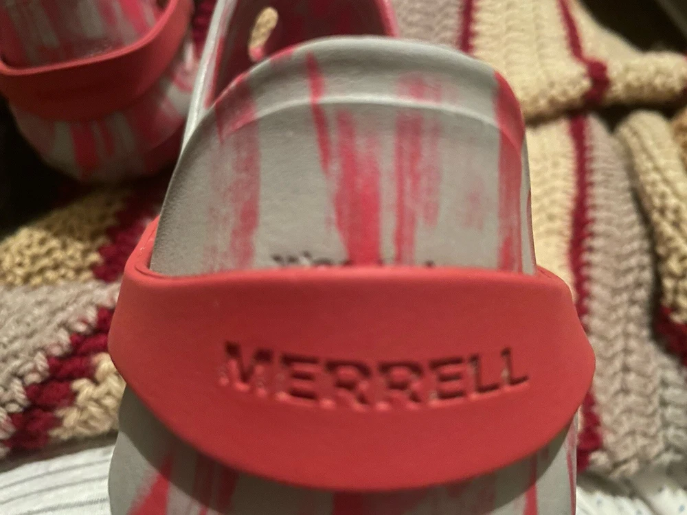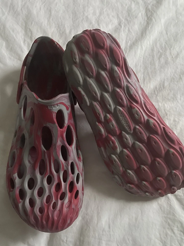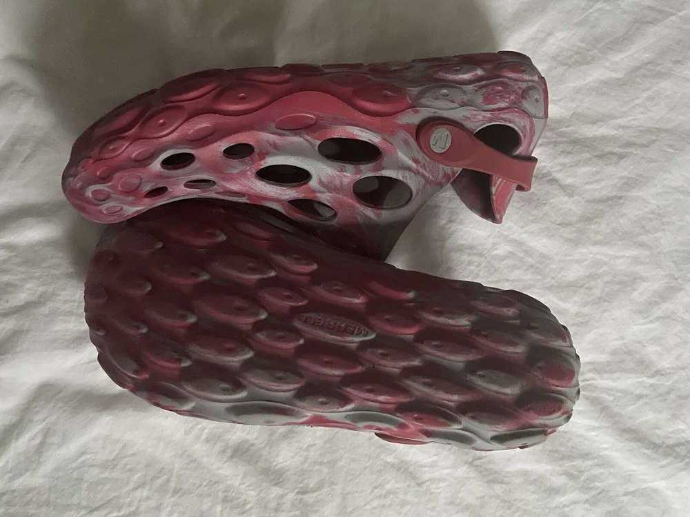 Merrell hydro pink and gray crocs. Womens size 10.5. Men’s size 9. Straps. Synthetic. Logo. Mint condition.