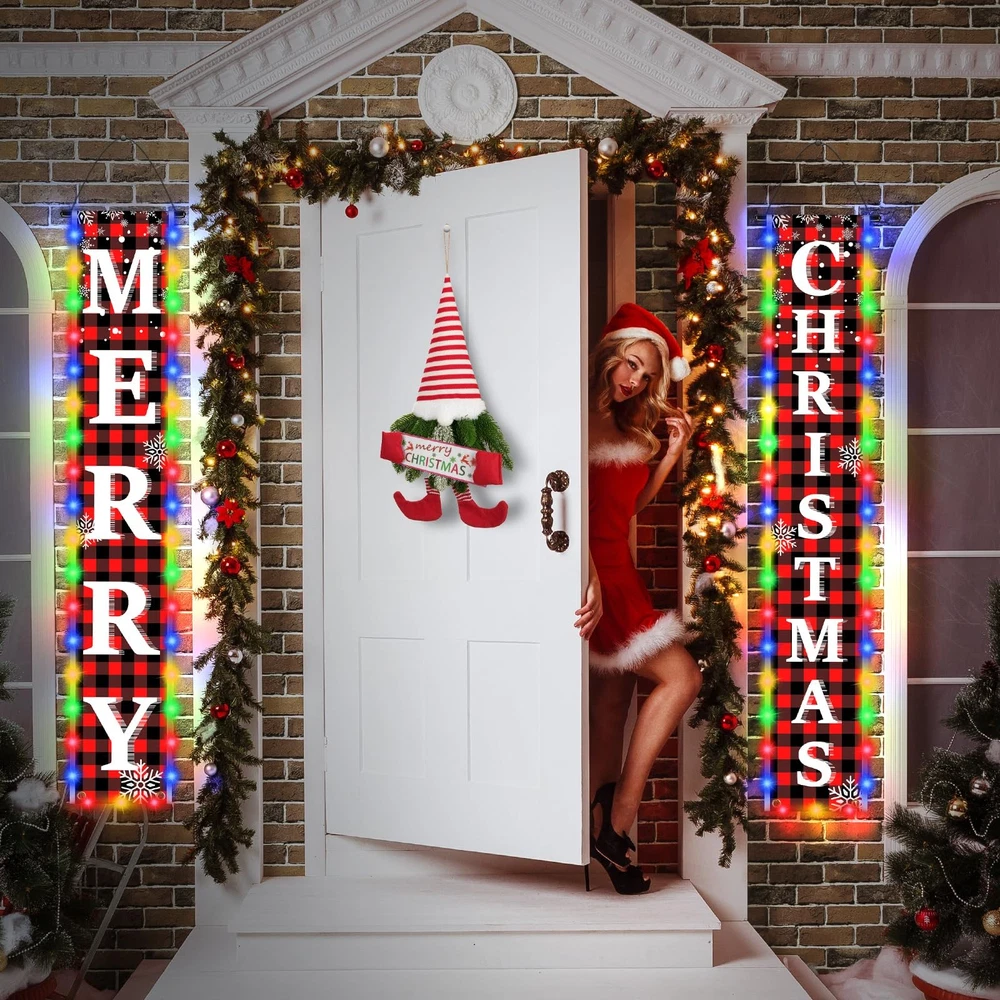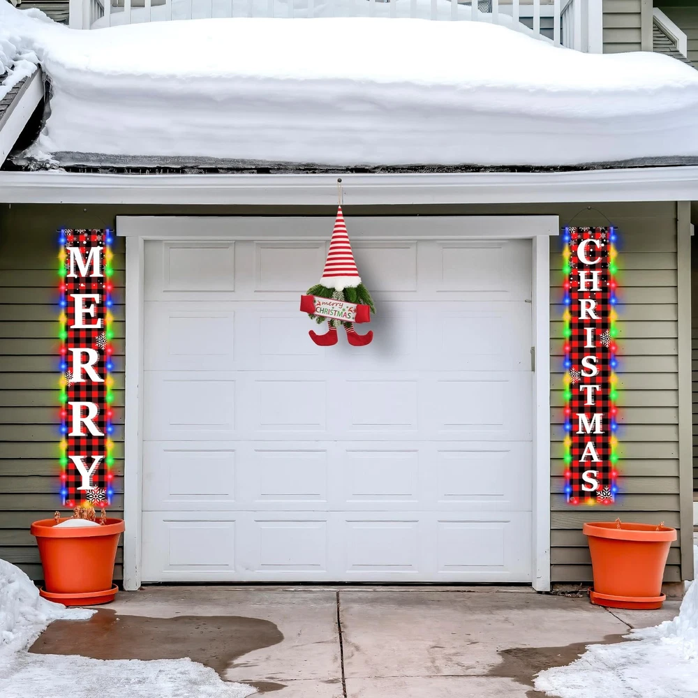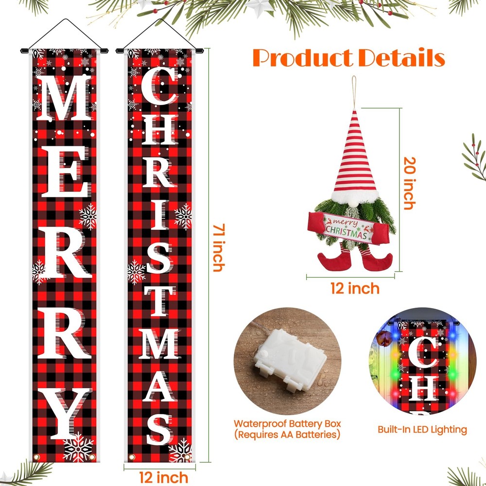 Merry Christmas Banner With Led Light and Gnomes Swedish Elf Garland , Gnomes Swedish Elf Garland,Party Supplies,Suitable For Decorating Indoor Front Doors Courtyards Walls During Holidays Festivals Outdoors,Christmas Decoration Set Generous size and design:The size of the merry christmas banner with lights is 71inches.Featuring classic elements such as snowmen, Santa Claus, Christmas grids,and bold "MERRY CHRISTMAS" with the "HO" pattern,as well as a 20 inchdiameter Christmas christmas door wreath showcasing a cute Swedish dwarf with a "Merry Christmas" greeting card in hand, warmly welcoming everyone and creating a vibrant and lively holiday atmosphere, perfect for taking photos. Easy to hang and install:The merry christmas door banner for inside has a sturdy top strap and integrated fixing rod, making it easy to hang. The bottom includes two washers that can be optionally fixed and comes with a white ribbon that can be easily hung anywhere.(Requires AA batteries, not included).For the Swedish elf garland, simply hang it up, it is easy to install, and the material is durable and comfortable. High quality and durable materials:The merry christmas lighted sign outdoor material is made of high-quality lightweight polyester fabric, ensuringhigh-resolution, realistic patterns with rich, fade resistant colors.It is foldable, wrinkle free, seamless, vertical, machine washable, and easy to store and usefor a long time.The christmas wreaths for windows is made of high-quality, durable,and non-toxic artificial pine needles.The dwarf has a soft plush hat (with internal metal wire for shape adjustment). Multi scenario use:Suitable for indoor and outside holiday party decoration. outdoor merry christmas light up sign or christmas wreath on doorway, front door, window, garden terrace, fences, wall, garage door, balconie, or corridor.erfect as a photo booth background, Christmas party decoration,New Year's party decoration,or winter home decoration,creating a joyful atmosphere anytime,anywhere. Perfect Christmas gifts and blessings:Christmas garage door banner sign create joyful scenes, and Dwarf Elves wreath carries the charm of folklore - Swedish dwarves are believed to guard homes,bringing good luck, happiness,and warmth.This is the perfect Christmas gift to express heartfelt wishes to family,friends,or loved ones,adding a touch of magic and protection to their vacation.It's not just a decoration but alsobrings joy to the season.
