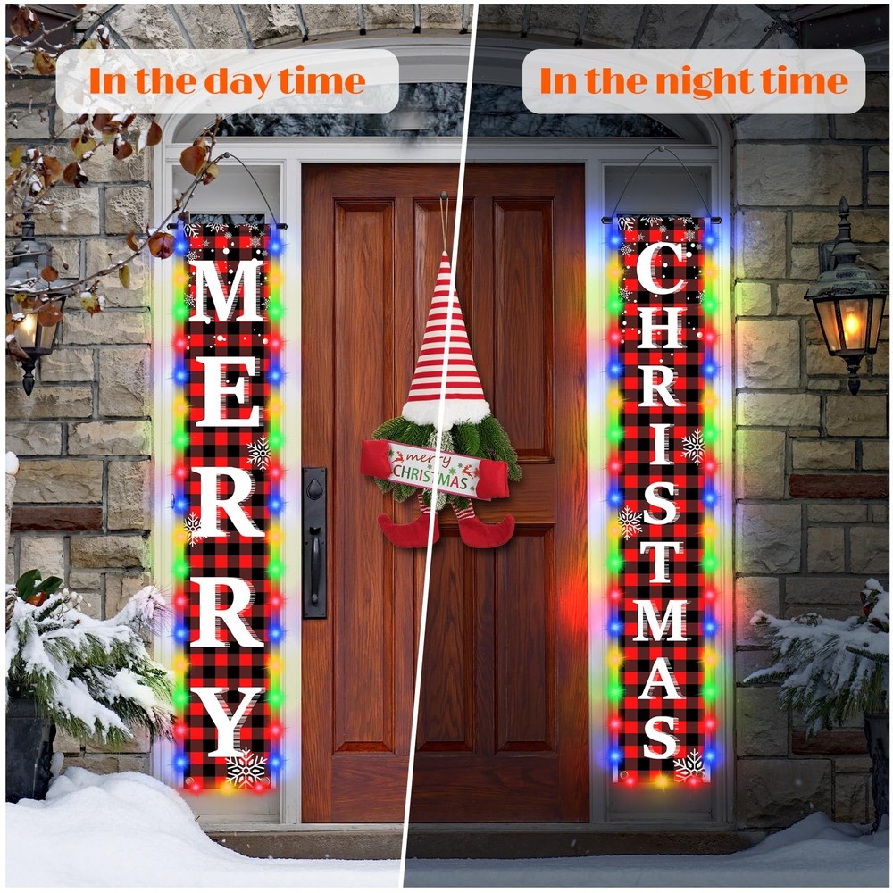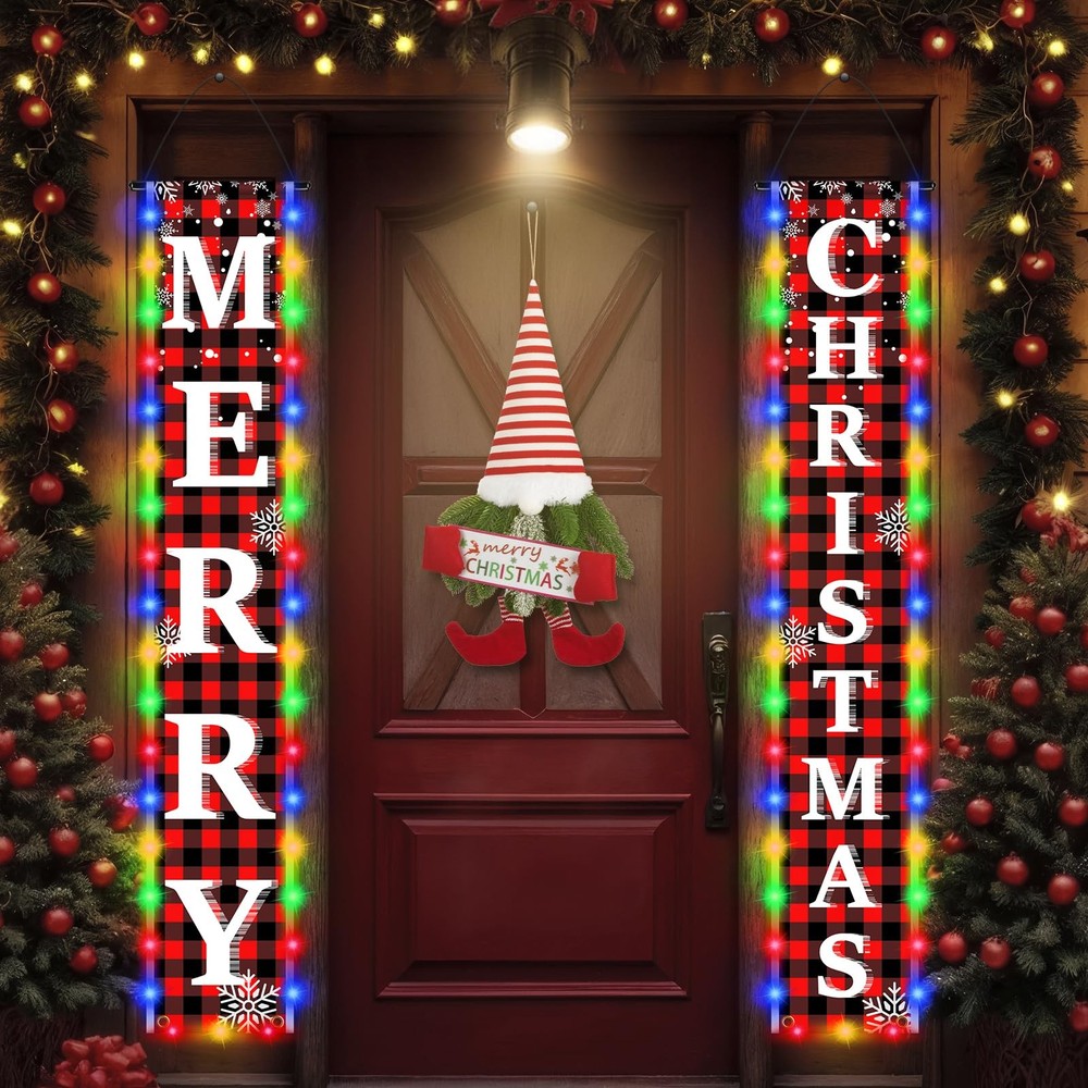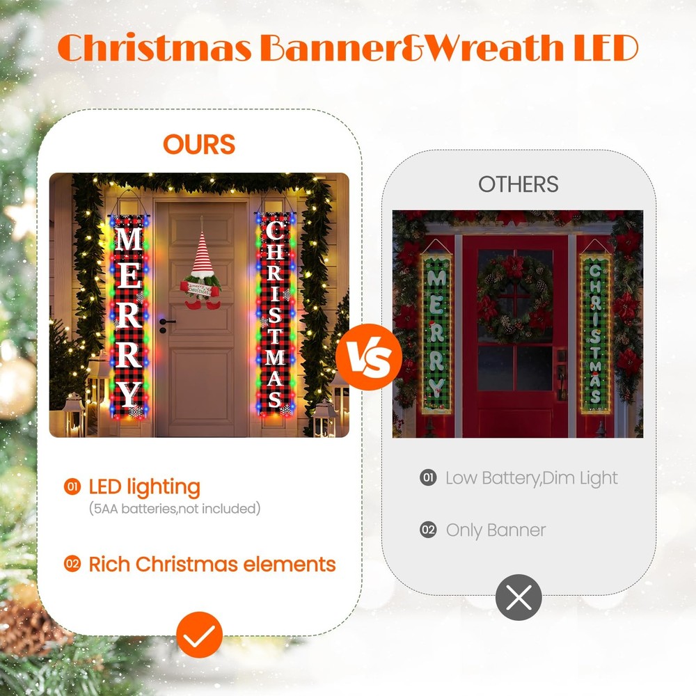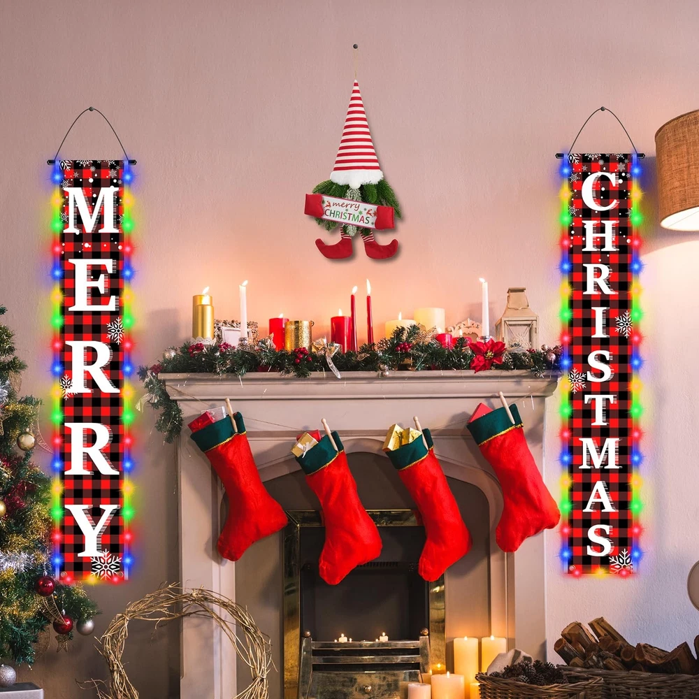 Merry Christmas Banner With Led Light and Gnomes Swedish Elf Garland , Gnomes Swedish Elf Garland,Party Supplies,Suitable For Decorating Indoor Front Doors Courtyards Walls During Holidays Festivals Outdoors,Christmas Decoration Set Generous size and design:The size of the merry christmas banner with lights is 71inches.Featuring classic elements such as snowmen, Santa Claus, Christmas grids,and bold "MERRY CHRISTMAS" with the "HO" pattern,as well as a 20 inchdiameter Christmas christmas door wreath showcasing a cute Swedish dwarf with a "Merry Christmas" greeting card in hand, warmly welcoming everyone and creating a vibrant and lively holiday atmosphere, perfect for taking photos. Easy to hang and install:The merry christmas door banner for inside has a sturdy top strap and integrated fixing rod, making it easy to hang. The bottom includes two washers that can be optionally fixed and comes with a white ribbon that can be easily hung anywhere.(Requires AA batteries, not included).For the Swedish elf garland, simply hang it up, it is easy to install, and the material is durable and comfortable. High quality and durable materials:The merry christmas lighted sign outdoor material is made of high-quality lightweight polyester fabric, ensuringhigh-resolution, realistic patterns with rich, fade resistant colors.It is foldable, wrinkle free, seamless, vertical, machine washable, and easy to store and usefor a long time.The christmas wreaths for windows is made of high-quality, durable,and non-toxic artificial pine needles.The dwarf has a soft plush hat (with internal metal wire for shape adjustment). Multi scenario use:Suitable for indoor and outside holiday party decoration. outdoor merry christmas light up sign or christmas wreath on doorway, front door, window, garden terrace, fences, wall, garage door, balconie, or corridor.erfect as a photo booth background, Christmas party decoration,New Year's party decoration,or winter home decoration,creating a joyful atmosphere anytime,anywhere. Perfect Christmas gifts and blessings:Christmas garage door banner sign create joyful scenes, and Dwarf Elves wreath carries the charm of folklore - Swedish dwarves are believed to guard homes,bringing good luck, happiness,and warmth.This is the perfect Christmas gift to express heartfelt wishes to family,friends,or loved ones,adding a touch of magic and protection to their vacation.It's not just a decoration but alsobrings joy to the season.