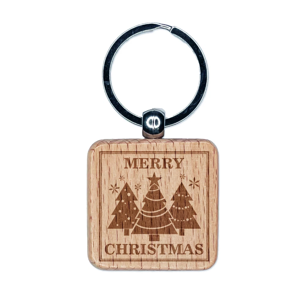 Merry Christmas Holiday Evergreen Trees Engraved Wood Square Keychain Tag Charm