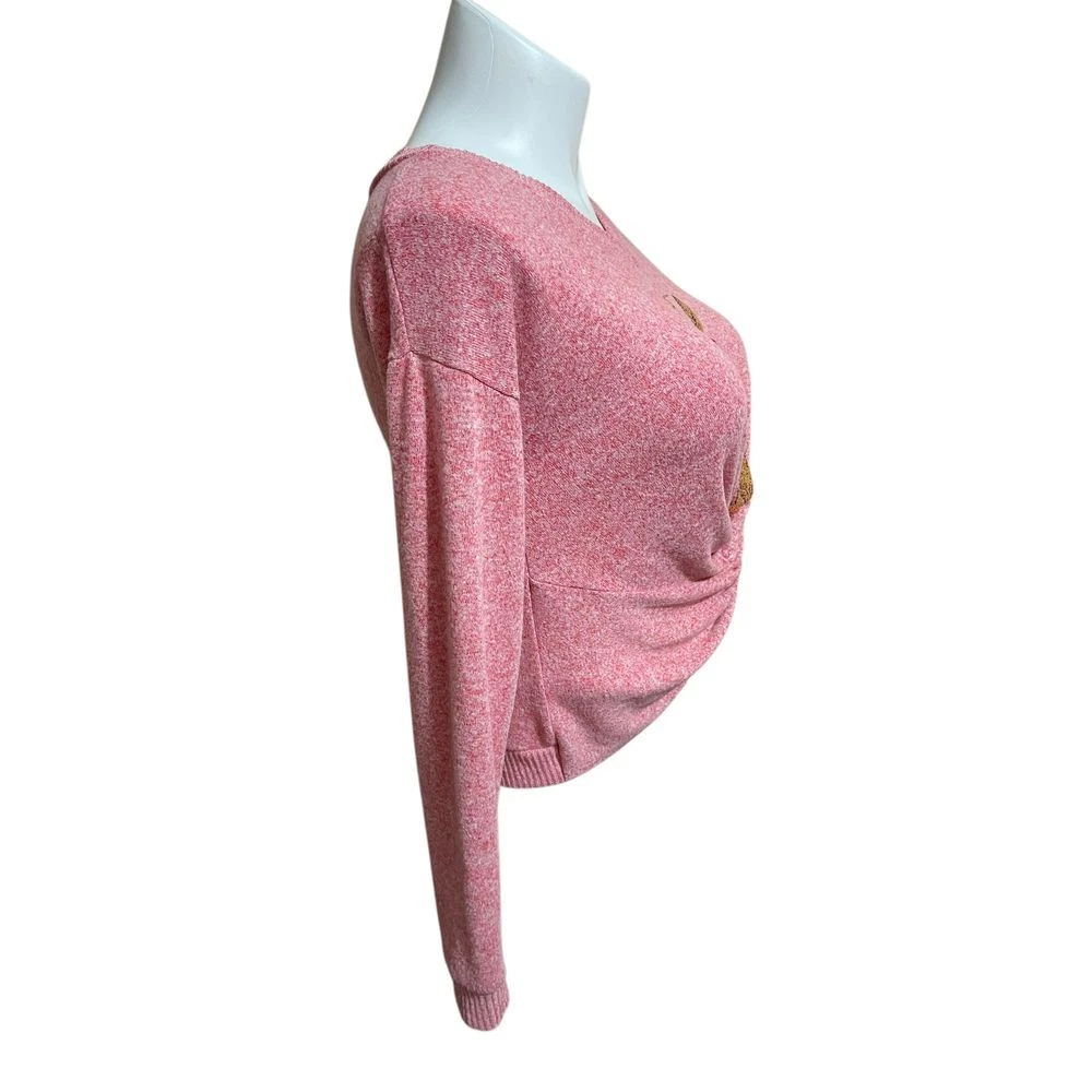 Make a festive statement with this playful pink sparkly sweater featuring a whimsical sequined Llama wearing sunglasses! The twisted front detail adds a modern, flattering touch. Perfect for holiday parties, casual Christmas gatherings, or adding some fun to your winter wardrobe. The soft knit material offers comfort while the sequin design brings the perfect amount of sparkle and cheer to any celebration. Style: Pullover Color: Pink Department: Women Type: Sweater Neckline: V-Neck Sleeve Length: Long Sleeve Pattern: Solid Features: Twisted Front, V-Neck, Sparkly Fabric, Holiday Design, Fitted Character: Llama Sleeve Type: Raglan Sleeve Fabric Type: Cotton/Rayon/Spandex Knit Accents: Sequins Condition: Good Preowned. A few sequins are missing. Please see all photos! Measurements approximate taken flat: Bust 17"/Waist 16.5"/Length 22" Keywords: christmas sweater, holiday pullover,reindeer, Llama, pink festive sweater, holiday party, winter fashion, novelty sweater, christmas outfit