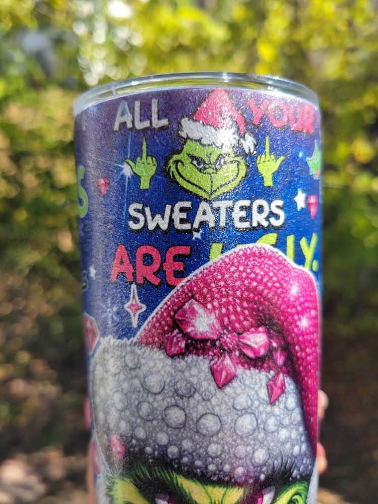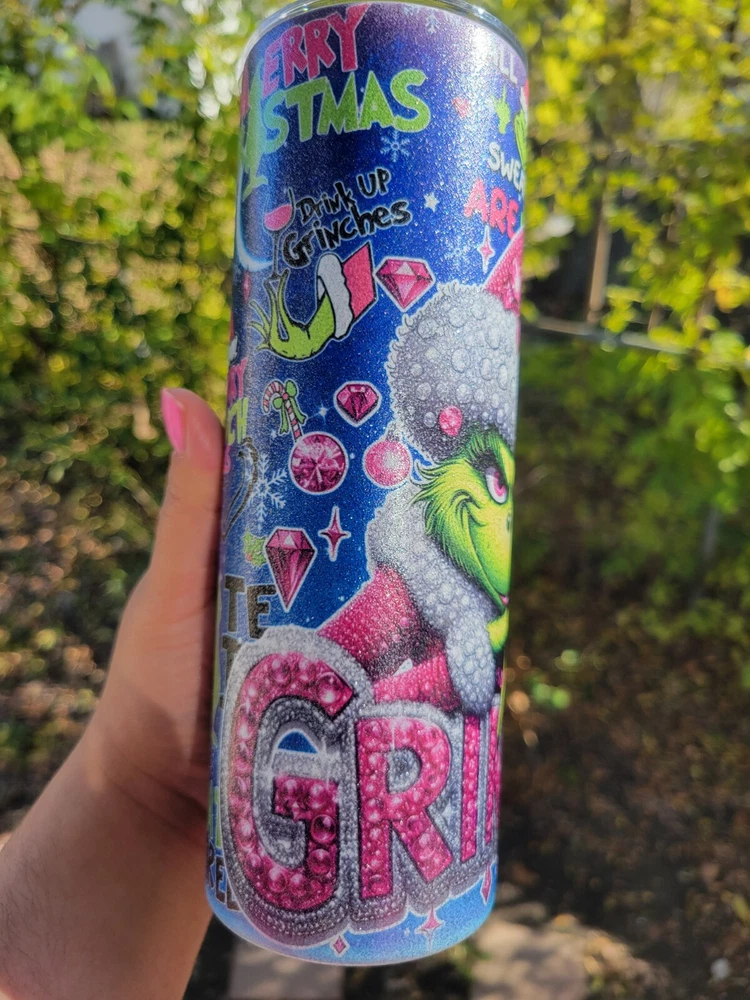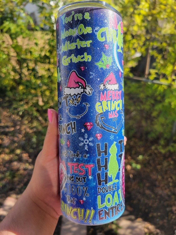 Merry Grinchmas Glitter 20 Oz stainless steel tumbler (glitter texture). Comes with lid and metal straw. Please note tumbler has image might find offensive (see second picture).