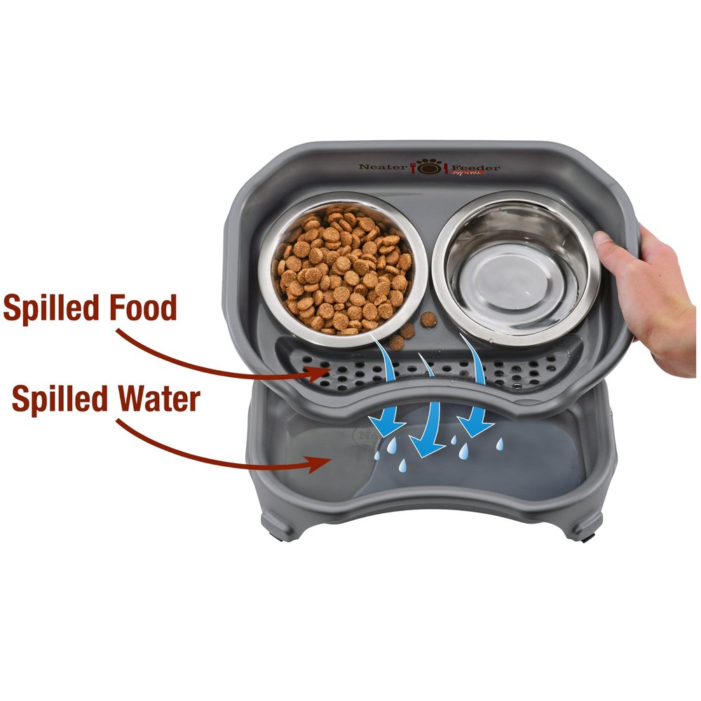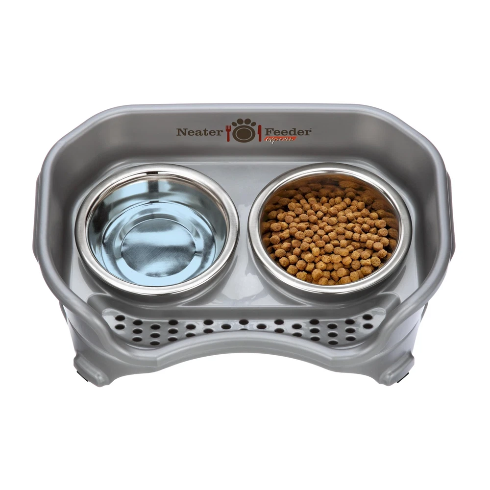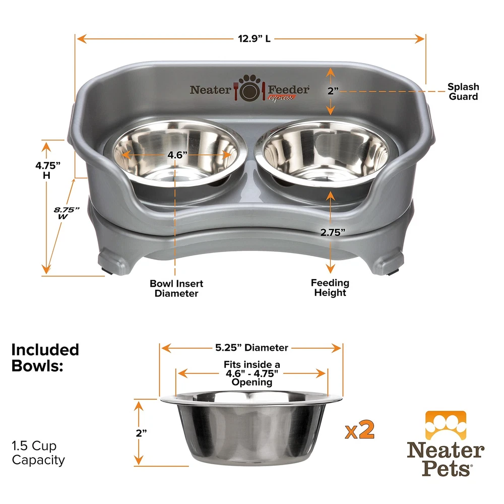 Mess proof dog feeding station — Spilled food is separated and contained at the top of the feeder, while spilled water drains into the catch basin below to keep your feeding area neat and clean. Made for small dogs — Our elevated dog bowls are designed for small dog breeds under 23 cm at the shoulder & under 8 kg in weight. Includes (2) 237 mL sized bowls. DISCLAIMER: Express is NOT compatible with any leg extensions. Save time cleaning — Spills and messes are completely contained within the dog feeding station, saving you time cleaning floors and walls. Dishwasher safe — All parts of the raised dog feeder, including the bowls, as well as top and bottom basins are 100% dishwasher safe. The is Made in the USA. The stainless steel bowls are made in India. Rubber feet — Comes equipped with non-skid rubber feet on the bottom of each leg to prevent sliding.