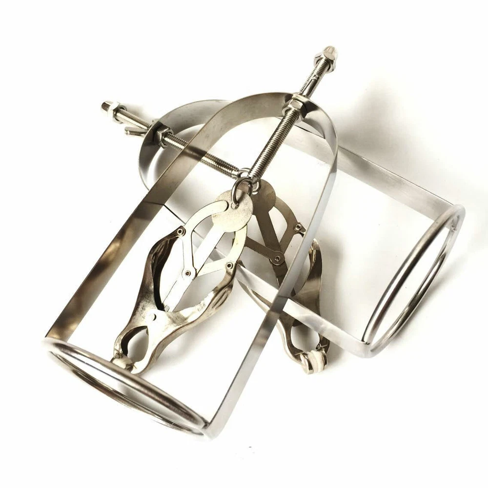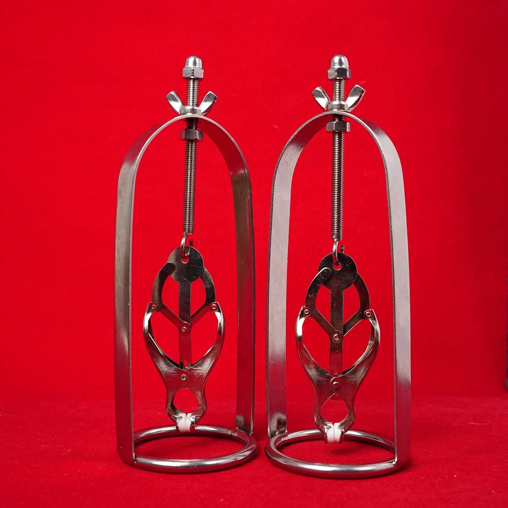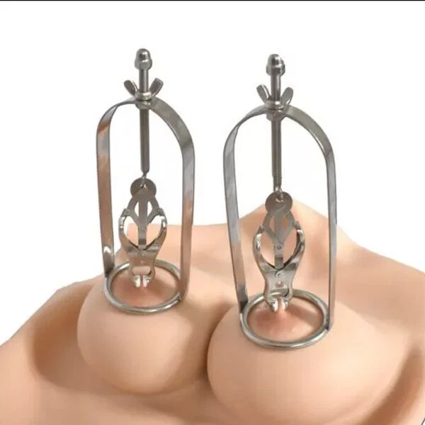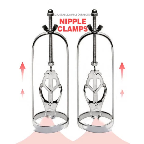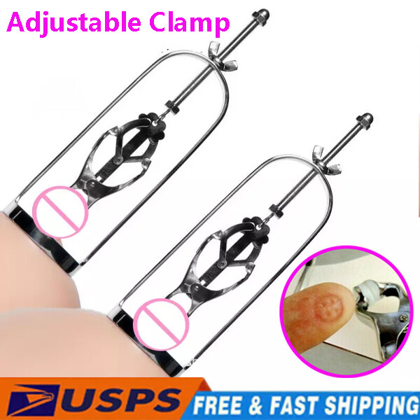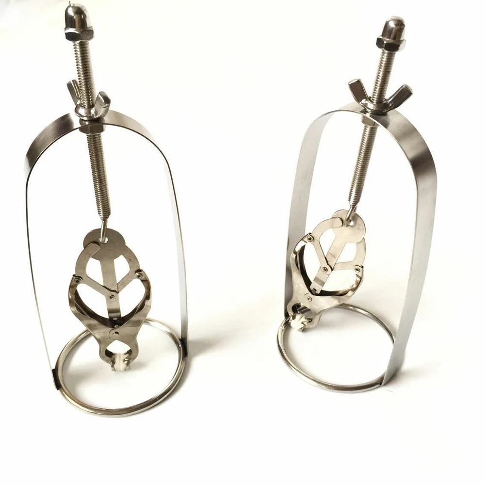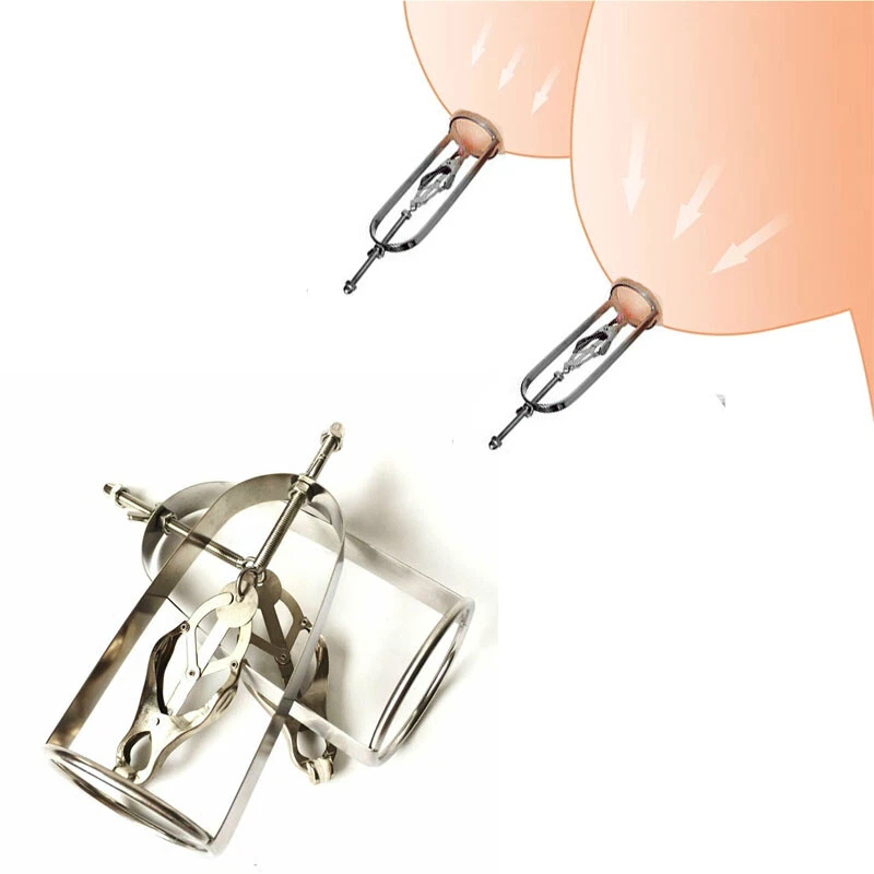 Discrete Package D escription: This protraction device is designed to clamp down on and then gradually stretch out the nipple. Comprised of a stainless steel frame supporting a dangling clover clamp, it is designed to grip tighter the further the nipple is stretched. Just affix the clamp just behind the nipple, and twist on the wing nut. As the clamp is pulled upwards, the grip is increased, stretching the nipple out. This unique piece can be used by both men and women, and is sure to guarantee the most intense nipple sensation. Measurements: Frame measures 2.10 inches in diameter, 6.5 inches in length; extractor extends to a top length of 2.5 inches Material: Stainless steel Color: sliver Note: Includes one pair devices Will Be Ship ped In A Discrete Package