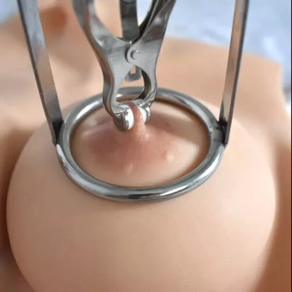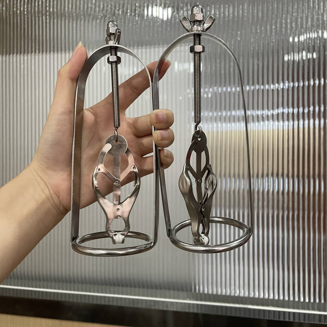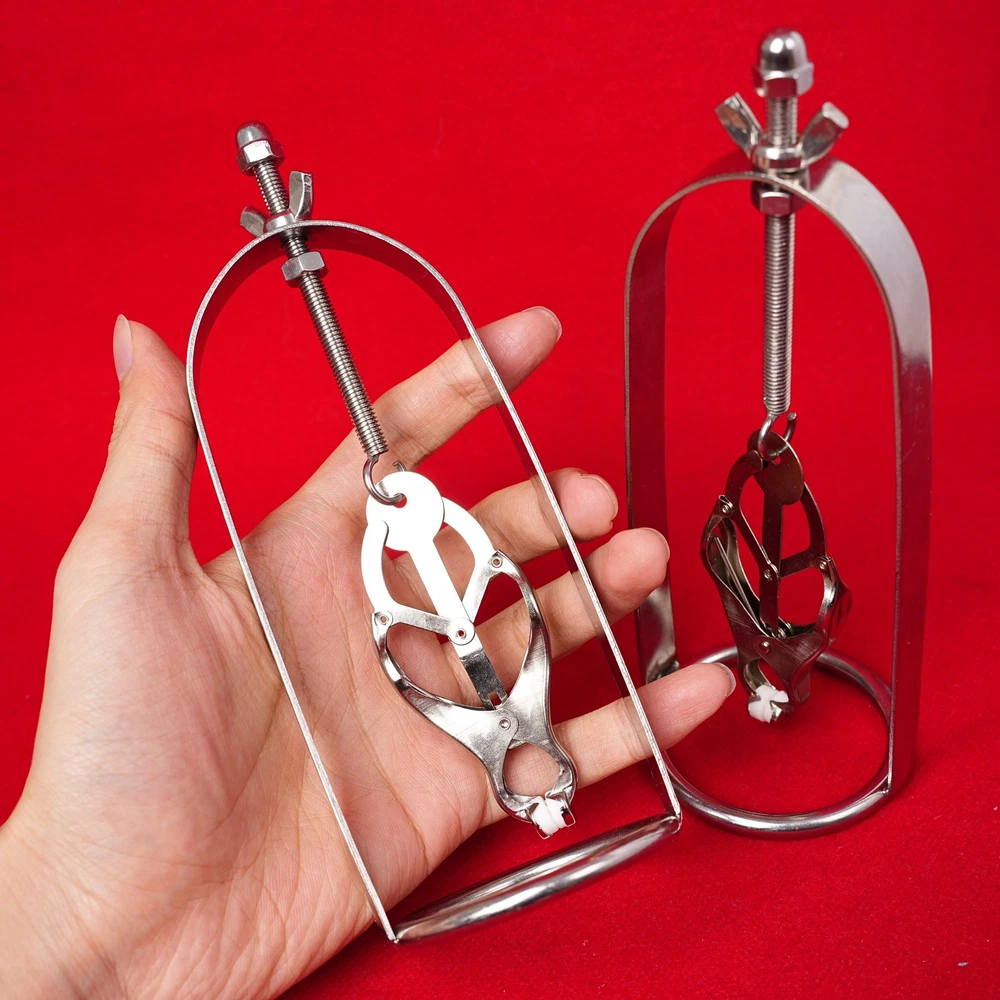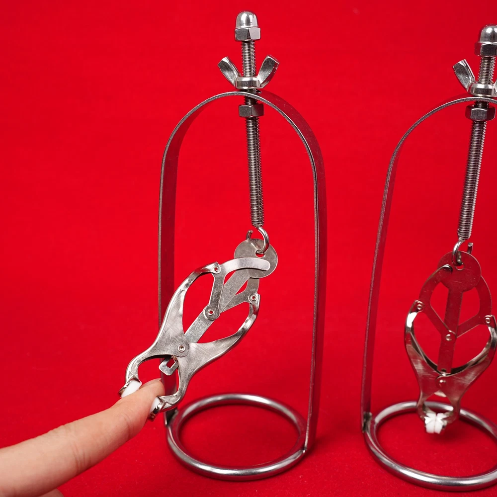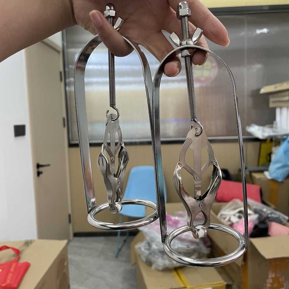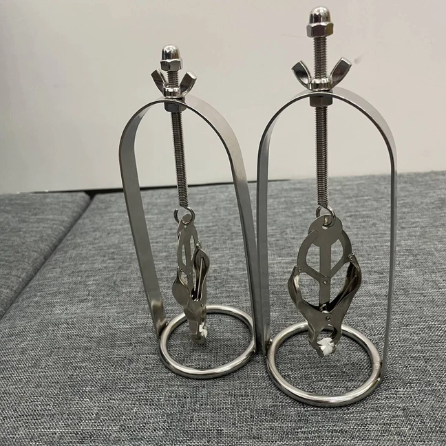Discrete Package D escription: This protraction device is designed to clamp down on and then gradually stretch out the nipple. Comprised of a stainless steel frame supporting a dangling clover clamp, it is designed to grip tighter the further the nipple is stretched. Just affix the clamp just behind the nipple, and twist on the wing nut. As the clamp is pulled upwards, the grip is increased, stretching the nipple out. This unique piece can be used by both men and women, and is sure to guarantee the most intense nipple sensation. Measurements: Frame measures 2.10 inches in diameter, 6.5 inches in length; extractor extends to a top length of 2.5 inches Material: Stainless steel Color: sliver Note: Includes one pair devices Will Be Ship ped In A Discrete Package
