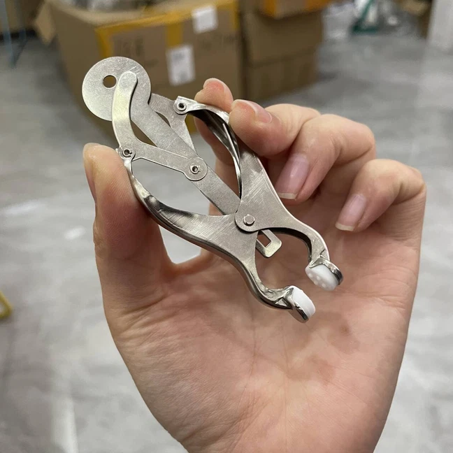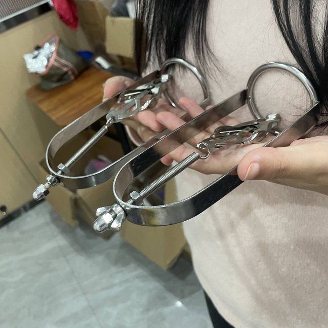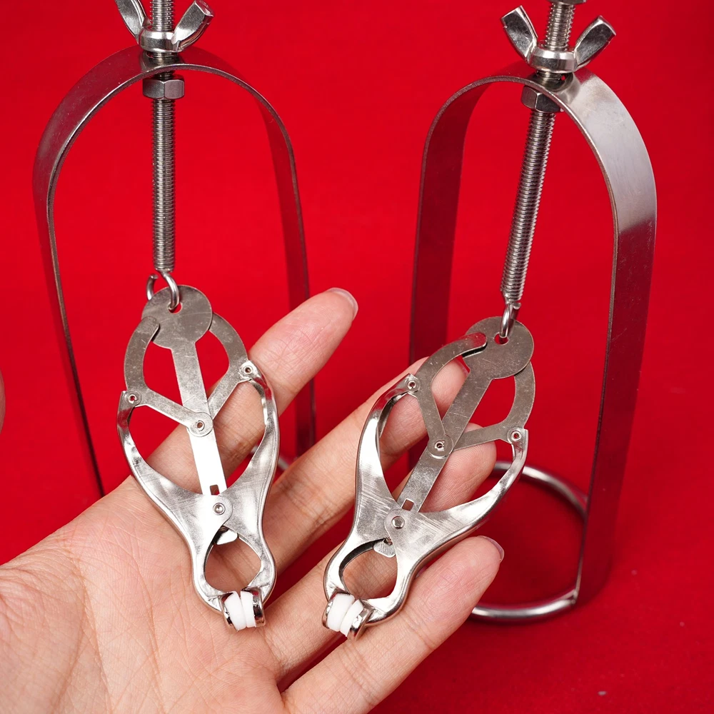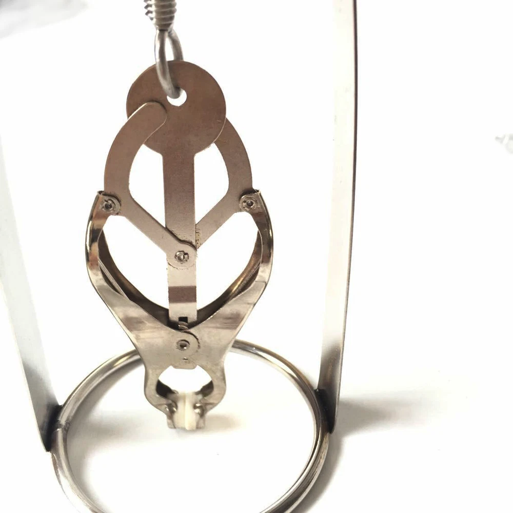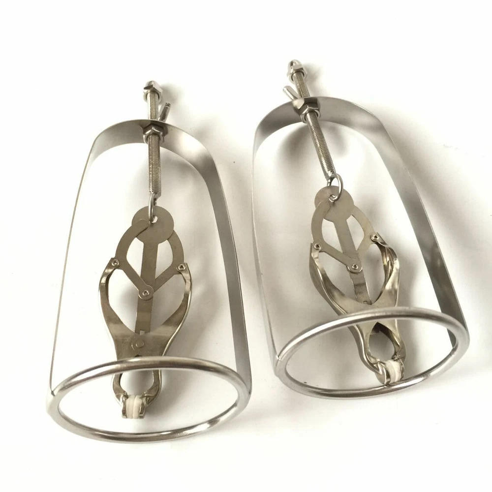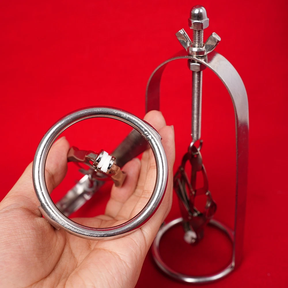 Discrete Package D escription: This protraction device is designed to clamp down on and then gradually stretch out the nipple. Comprised of a stainless steel frame supporting a dangling clover clamp, it is designed to grip tighter the further the nipple is stretched. Just affix the clamp just behind the nipple, and twist on the wing nut. As the clamp is pulled upwards, the grip is increased, stretching the nipple out. This unique piece can be used by both men and women, and is sure to guarantee the most intense nipple sensation. Measurements: Frame measures 2.10 inches in diameter, 6.5 inches in length; extractor extends to a top length of 2.5 inches Material: Stainless steel Color: sliver Note: Includes one pair devices Will Be Ship ped In A Discrete Package
