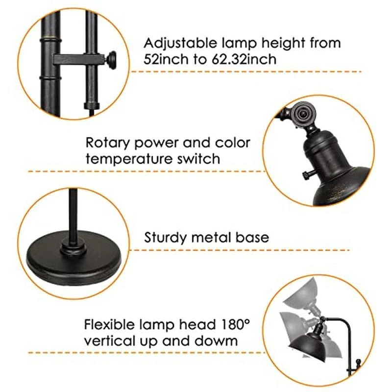 You may also like Portable Smokeless Fire Pit Stainless Steel Camping Bonfire Low Smoke Heat New 109.71 USD 115.48 USD Free shipping 5% off Eco-Friendly Computer Desk W/ CPU Shelf Two Drawer Storage Home Office Portable 33.88 USD 35.66 USD Free shipping 5% off Squirrel-Proof Bird Feeder 6 Feeding Ports Easy-Refill Durable Metal Hanger New 68.58 USD 72.19 USD Free shipping 5% off 3-Tier End Table Compact Nightstand Bedside Storage Table Plastic Poles New 27.06 USD 28.48 USD Free shipping 5% off Compact Computer Cart Heavy Duty MDF Storage Adjustable Shelves Locking Casters 68.95 USD 72.58 USD Free shipping 5% off Inflatable River Raft Float Tube 1-6 Person W/ Cupholders Mesh Bottom Backrest 51.52 USD 54.23 USD Free shipping 5% off Three-Light Indoor Island Pulley Pendant Vintage Industrial Metal Fixture New 137.59 USD 144.83 USD Free shipping 5% off Faux Wood Coffee Table Modern Industrial Living Room Bedroom Office 43x24 In New 89.76 USD 94.48 USD Free shipping 5% off Full Spectrum Floor Lamp Adjustable Bendable Neck Natural Light Reading Craft 43.66 USD 45.96 USD Free shipping 5% off 5 Pcs Rustic Wooden Storage Crates Nesting Handles Decorative Farmhouse Boxes US 54.84 USD 57.73 USD Free shipping 5% off Baby Bottle Warmer Breast Milk Food Heater Universal Safe Easy Nurturing Plastic 60.83 USD 64.03 USD Free shipping 5% off Magnetic Glass Board W/ Floating Shelf 35in Wall Mount Dry Erase Office Home New 159.29 USD 167.67 USD Free shipping 5% off About this item Exquisite Craftsmanship Vintage Floor Lamp: Our floor lamp combines modern style with vintage design, the lamppost and lamp shade are made entirely of metal before being slightly distressed. To stand out from the ordinary, we specially hired experienced craftsmen to hand-paint some golden highlights on the rustic floor lamp, bringing more retro sense! The detail installation please see the video of product page or pictures of installation instructions. Fully Adjustable & Sturdy Base: Compare with other floor lamps with a short size and fixed height, our task floor lamp can adjust height between 52'' and 62. 32'' to accommodate various spaces. This tall lamp weighs 13. 4lb include a 9. 59lb metal base, so the base can fully bear the whole lamp safe to be your bedroom lamp, living room lamp, working lamp, reading lamp! The detail installation please see the video of product page or pictures of installation instructions. 3CCT 9W LED Bulb Included: For your convenience, we offer a 9W LED bulb which has 1100 lumens high brightness can illuminate any dark place easily. This standing lamp features 3 color temperatures from 3000K to 5000K. Enjoy a cozy night with families in 3000K light, choose 4000K for a daily life, while 5000K is perfect for reading or working. Rotary Power Switch & ALEXA Compatible Standing Light: The farmhouse floor lamp is controlled by a rotary switch on the lamp head, easy to turn on/off. To keep pace with smart lifestyles, this living room floor lamp is also compatible with smart plugs (not included) and smart bulbs (E26 base bulb), and then can work with Alexa, Google Home Assistant & Apple Homekit (Siri) to turn on/off. Enjoy more intelligent experience to your life, also a great choice for housewarming! Easy to Install: The installation step is clear and concise, please see the video of product page or pictures of installation instructions. Also, we have prepared instructions in the package and the product page. › product details Finish Type Brushed Base Material Metal Bulb Base E26 Product Dimensions 9. 13"D x 11. 02"W x 62. 32"H Item Weight 13. 4 Pounds Versatile Wicker Storage Trunk Collapsible Home Office Dorm Living Room Rattan 151.65 USD 159.63 USD Free shipping 5% off Collapsible Storage Bins W/ Lids Clear Window Stackable Durable Fabric 3 Set New 54.84 USD 57.73 USD Free shipping 5% off Nesting Wooden Crates Rustic Storage Farmhouse Home Organization Nested Set 3 54.76 USD 57.64 USD Free shipping 5% off 360° Rotating Jewelry Box 5 Drawers Organizer Glass Window Vertical Storage New 79.78 USD 83.98 USD Free shipping 5% off Night Stand W/ Charging Station Small Dresser 4 Drawers Multi-Use Storage Table 59.81 USD 62.96 USD Free shipping 5% off Bamboo Storage Box W/ LED Light Lockable Organizer Lifting Handle Removable Tray 59.75 USD 62.89 USD Free shipping 5% off Handwoven Rattan Storage Basket W/ Lid Square Washable Durable Stackable Brown 159.58 USD 167.98 USD Free shipping 5% off 3-Tier End Table Compact Nightstand Bedside Storage Table Plastic Poles New 27.06 USD 28.48 USD Free shipping 5% off Wooden Jewelry Box Organizer Lockable W/ Mirror Drawers Compartments Women New 109.7 USD 115.47 USD Free shipping 5% off Bookshelf W/ Storage Cabinet 2 Shelves Open & Closed Durable Organizer Home New 46.01 USD 48.43 USD Free shipping 5% off Modern Marble Decorative Storage Boxes Set 3 Keepsake Container Gold Handle New 84.65 USD 89.11 USD Free shipping 5% off Cabinet Drawer Unit Wood Kenner Home Office Reclaimed Wood Rolls Easily Durable 155.75 USD 163.95 USD Free shipping 5% off