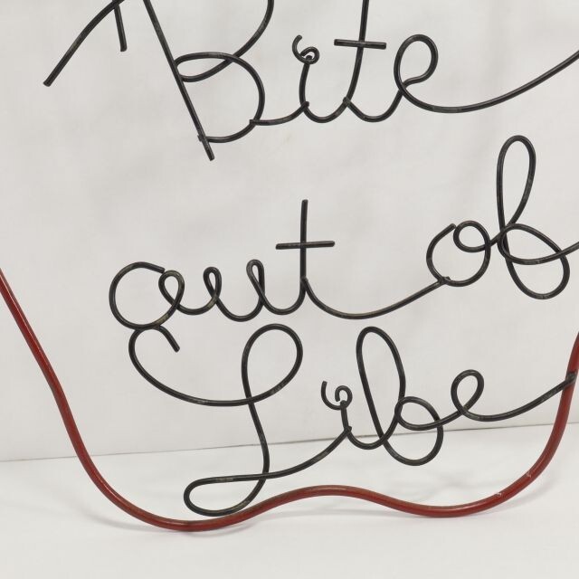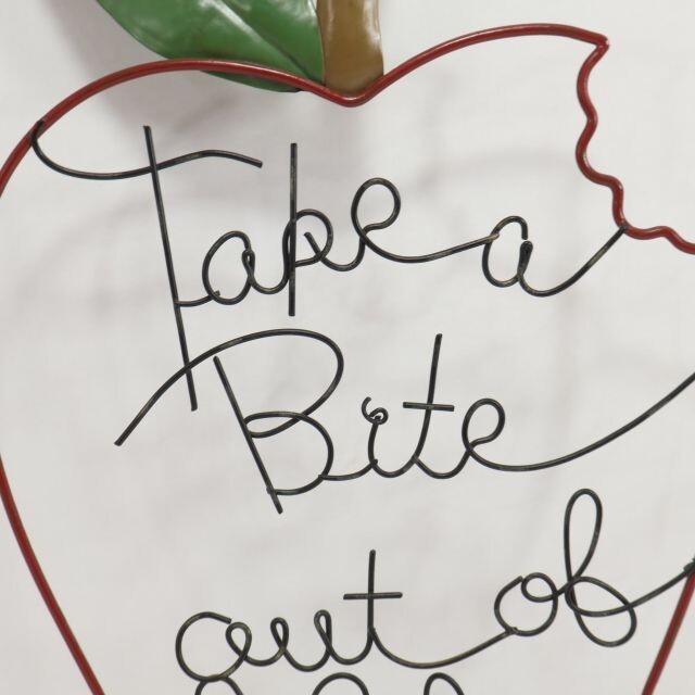 Up for your consideration is a decorative metal apple wall art ....."Take A Bite Out Of Life" message. It measures 8" x 9" (just measuring the apple). Some of the black on the lettering has minor discoloration. Metal in good condition.