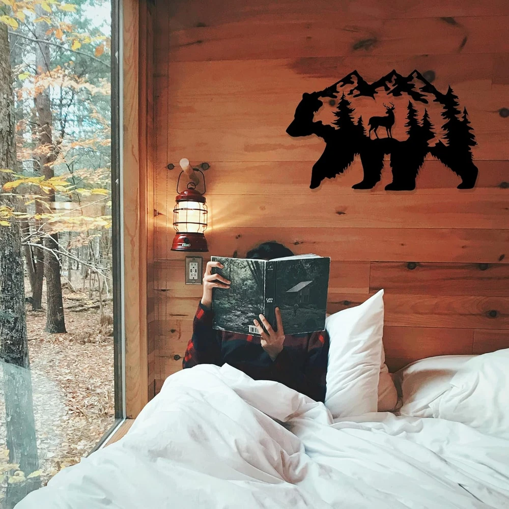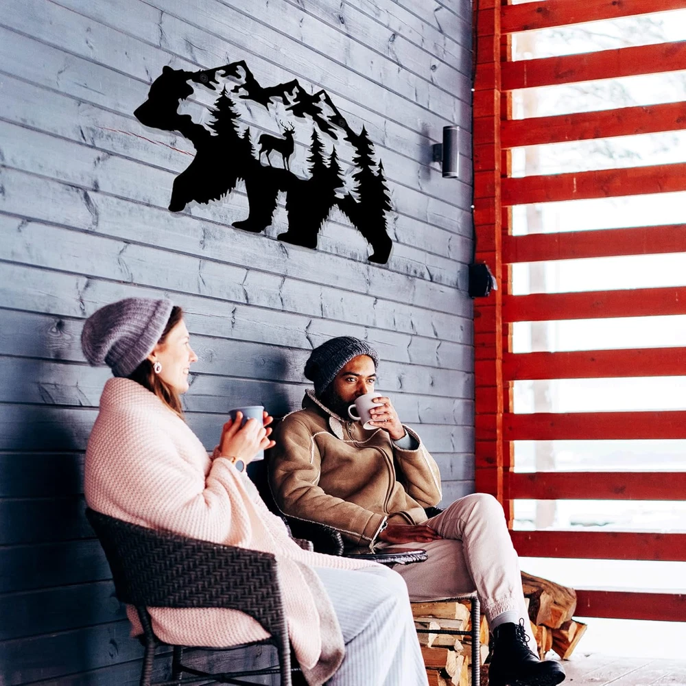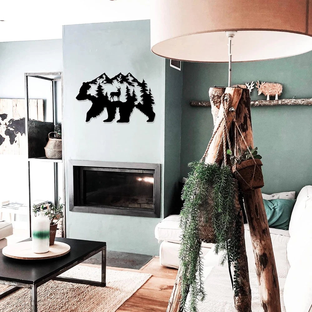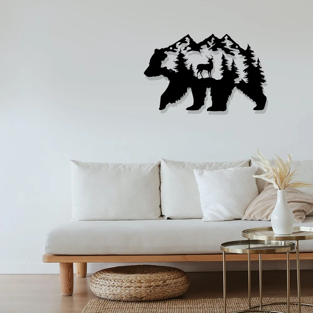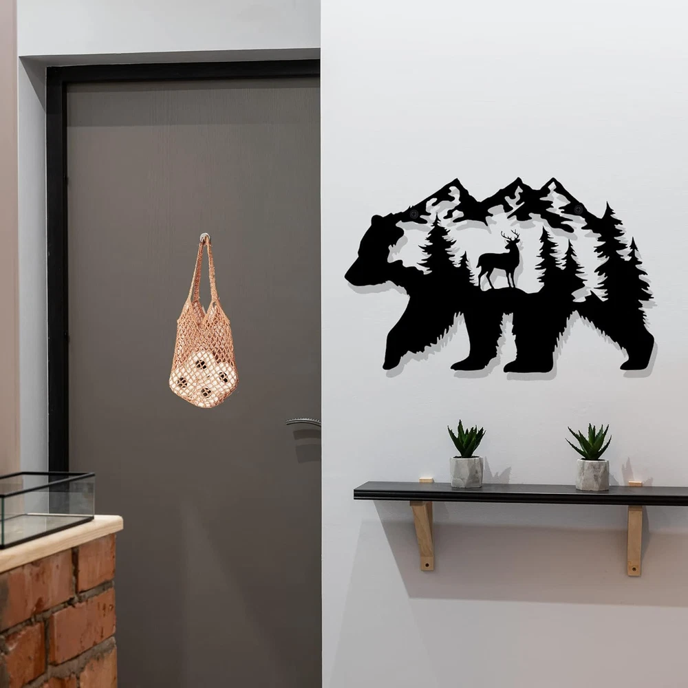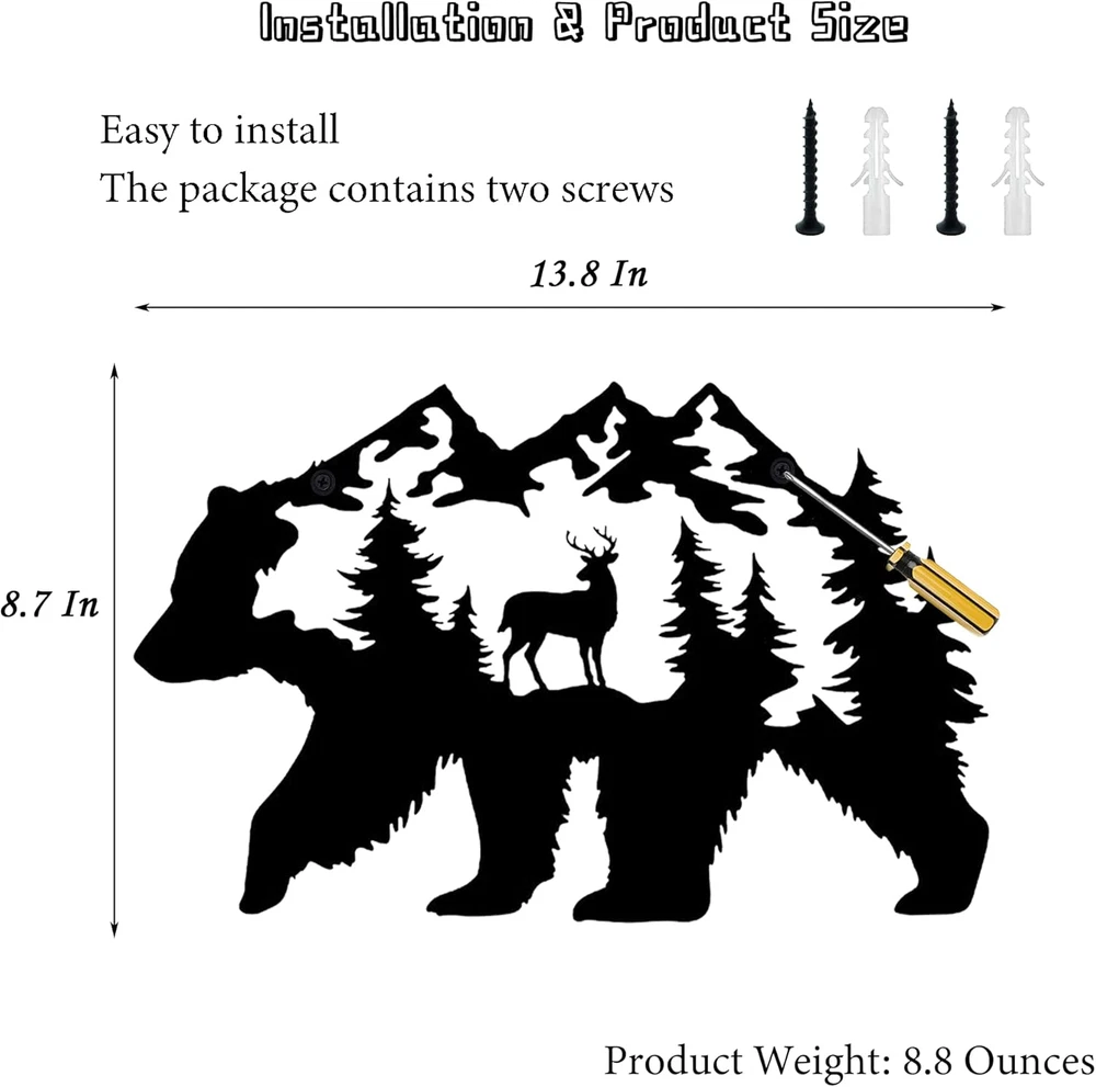 【CABIN DECOR】 This amazing bear decoration is doing work on the wall of your house. It's an incredible gift and great addition to your room. Make your cabin house looks wonderful! 【UNIQUE DESIGN】 Our metal bear wall art is designed with bear, moose and pine needles tree pattern. The exquisite laser cutting technology of this metal wall decor makes the wildlife scene looks lifelike. 【SIZE & MATERIAL】The dimensions of this bear wall decoration is 14 x 8.5 Inch. It is made of metal, which is sturdy and reliable to use. 【PERFECT GIFT】It is a great gift for relatives and friends, especially bear lovers. When they receive this funny black bear decor, they will be immersed in the great atmosphere. 【EASY TO INSTALL】This metal bear decor is designed with 2 holes for easy hanging. There are 2 expansion screws inside the package so you can easily mount it anywhere you want. D E S C R I P T I O N : This metal bear wall art is designed with bear, moose and pine needles tree pattern. The exquisite laser cutting technology of this metal wall decor makes the wildlife scene looks lifelike. S P E C I F I C A T I O N S : - Name: Metal bear wall decor - Main color: Black - Product size: 14 x 8.5 Inch (approx. ) - Product material: Metal - Application: Cabin room, living room, bedroom. P A C K A G E I N C L U D E D : 1 * Metal bear wall decor 2 * Expansion screws W A R M P R O M P T : 1. Installation requires two screws with a diameter of 0.5 cm. (Included) 2. If you have any questions please contact us. We will gladly help you.