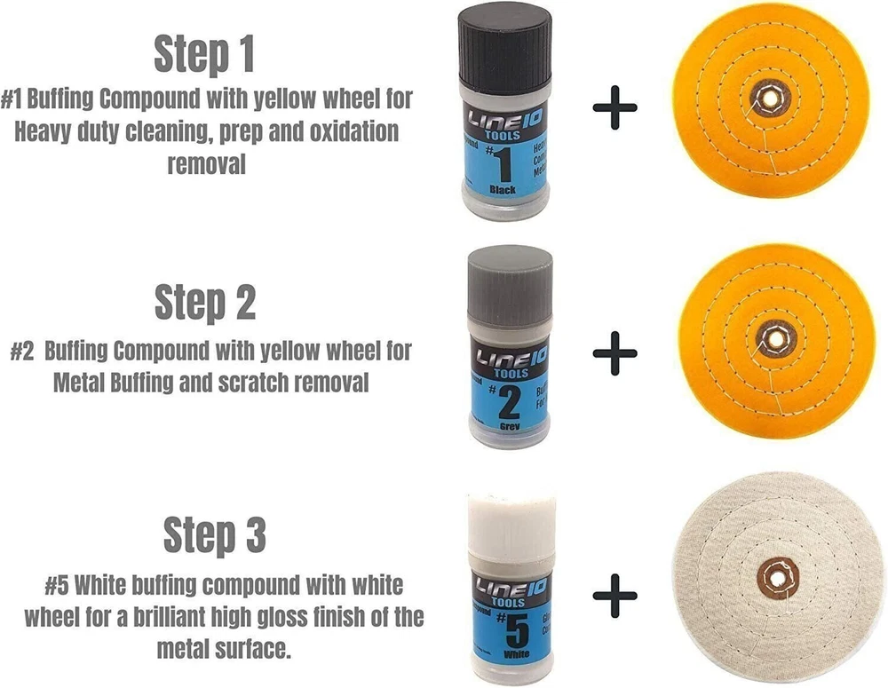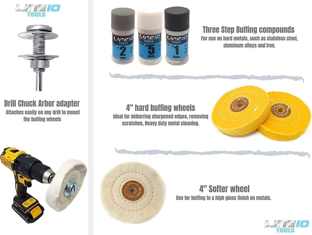 eBay Listing Template: LM-Raven LINE10 Tools Metal Buffing Kit for Drill 4 Inch Wheel for Polishing Hard Metals 7pc Product Features: Kit includes everything you need to transform your drill into a metal buffing and polishing machine Three easy steps for buffing and polishing hard metals such as Stainless Steel, Iron, and Aluminum Alloys Restore the shine back to your automotive trim, aluminum wheels, and stainless steel hardware, appliances, and parts Portable and convenient, this kit comes with a handy drill arbor adapter with a universal 1/4-inch round shank Compatible with all electric and cordless drills and drill-presses. Overview: #1 Buffing Compound With Yellow Wheel Apply the #3 compound onto the yellow wheel for heavy-duty cleaning and oxidation and tarnish removal, If needed. #2 Buffing Compound With Yellow Hard Wheel Apply the #3 compound onto the yellow hard wheel for medium buffing of metal. to remove scratches and blemishes, repeat until the color is clear and unified. #5 Buffing Compound With White Soft Wheel Apply the # 6 compound onto the white soft wheel, and repeat this step until you get the desired high gloss mirror-like finish. This Kit Includes: Drill Chuck Arbor Adapter Allows you to transform any drill into a buffing and polishing machine. Two 4" Hard Buffing Wheels Ideal for honing sharpened edges, removing scratches, and heavy-duty metal cleaning. 4" Soft Buffing Wheel Ideal for high gloss buffing and polishing metal surfaces to a mirror-like finish Three-Step Buffing Compounds Ideal for polishing hard metals, stainless steel, aluminum alloys, and iron. It is Super Easy and Can be Attached to Any Drill! Included arbor adapter will allow you to mount the buffing wheels on your drill. With a universal round 1/4-inch shank, you are able to transform your ordinary drill into a versatile, portable buffing machine. Amazing Results! Ideal for buffing and polishing hard metals such as stainless steel, iron, and aluminum alloys. Restore the shine back to your automotive trim, aluminum wheels, and stainless steel hardware, appliances, and parts. More than just an online store; we're here to inspire you to pick up your tools and start creating! Established in 2012, we bring you the versatile solutions you need to get your arts & crafts or home improvement projects off the blueprints and into reality.