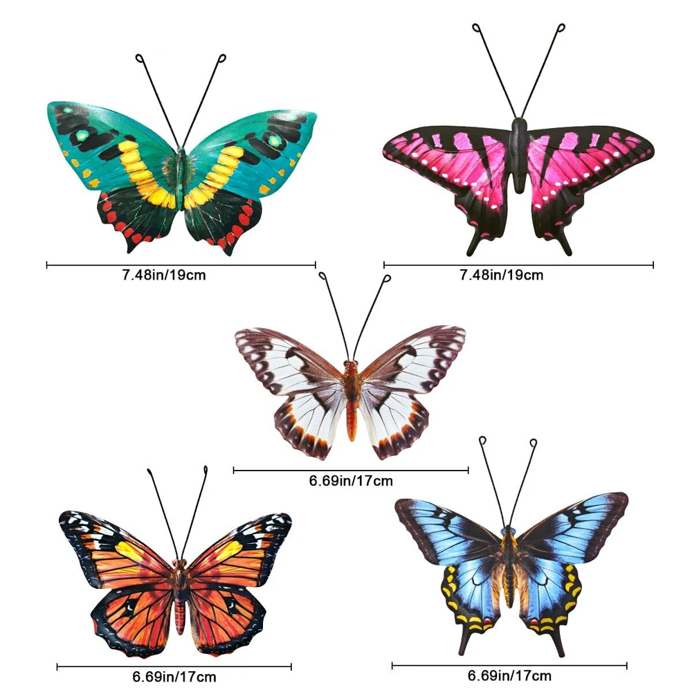 PACKAGE INCLUDE - Set of 5 PCS lifelike metal butterflies with realistic patterns and bright colors that will give you more energy no matter where you decorate. RUST-PROOF - Made of high-quality iron, It is treated with anti-rust technology to make the metal butterfly more durable and keep the color uneasy lost. Make the metal butterfly keeps its beautiful appearance under the sunlight and raining day. EASY TO HANG - There is a keyhole on the back of the butterfly, which can be hung directly on the nail/hook, you can easily hang them on the tree, fence, door or wherever you want. REALISTIC 3D EFFECT - you can fold the wings of the butterfly to stand up, so that the butterfly looks more realistic, and the spring hook design can make the butterfly dance in the wind, It looks more real. WIDELY USED - a great idea for indoor and outdoor decorating, these realistic metal butterflies can be perfect for decorating backyards, fences, gardens, walls, trees, bedrooms, living rooms, TV background walls, walkways, doors or entrances. When you order 3D metal butterfly wall decor today, you have 60 days of protection and no problem money back . There is no risk at all, why not try it?