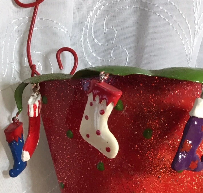 Add a festive touch to your Christmas decor with this metal wall hanging decor. This glittery piece is sure to catch the eye of your guests. Crafted from high-quality materials, it is durable and long-lasting. Ideal for the holiday season, it is a great addition to your home decor. Whether you are looking to add a touch of elegance to your living room or create a cozy atmosphere in your bedroom, this Christmas stocking is the perfect choice. Measurements approximately: 15-1/4’ tall with handle 10-1/4’ tall without handle 7-3/8’ wide 3-1/4’ deep