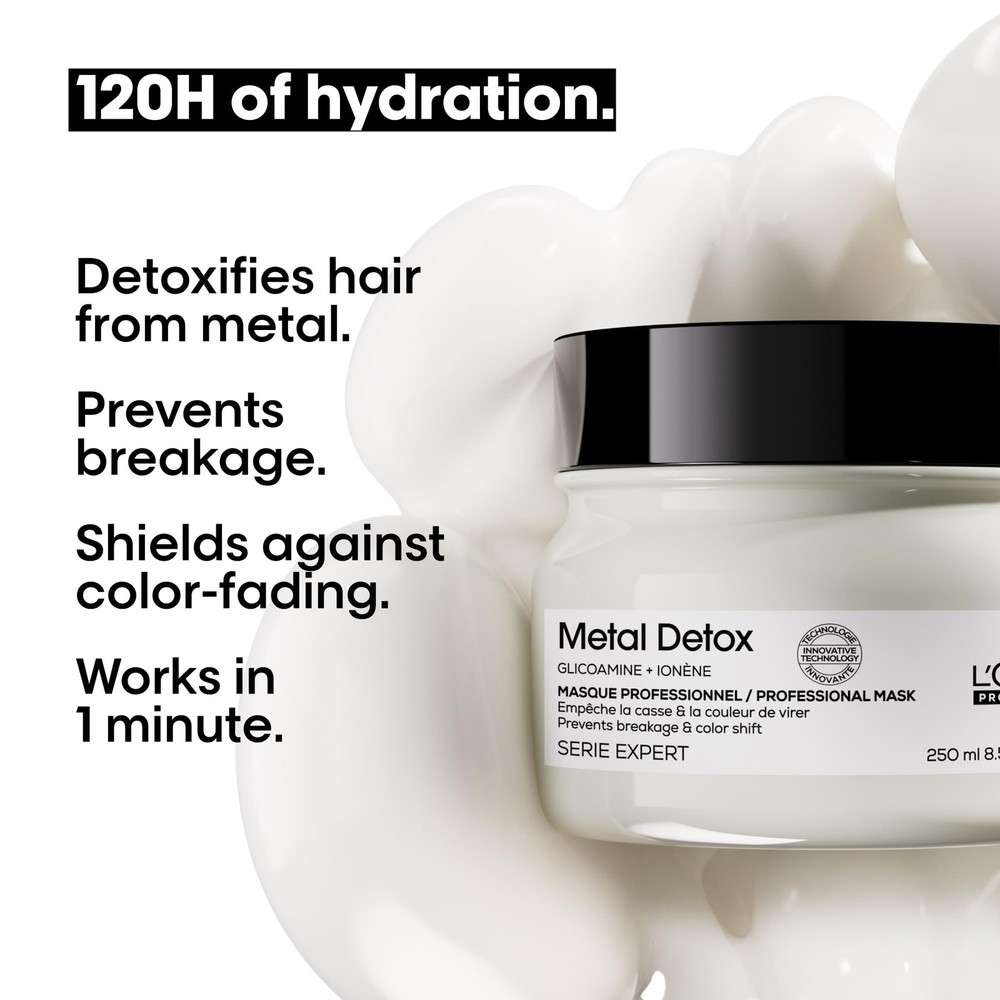 Anti-Breakage Hair Mask: Intensely nourishes hair and prevents breakage. Benefits: Sulfate-free formula that clears hair from metals that cause breakage damage and lack of shine. Helps to maintain hair color vibrancy and revives shine. Additional Benefits: Provides deep nourishment and hydration that does not weigh hair down and prevents harmful particles in water from penetrating the hair's fibers. For all color-treated hair. Metal Detox Collection: For best results use the Metal Detox regimen of shampoo and hair mask to achieve 100% reliable color results 87% less risk to breakage and weightless nourishment. Suggested Use: Apply evenly on shampooed and towel-dried hair. Leave on the hair for 1 minute and rinse thoroughly. For best results pair with Metal Detox shampoo.