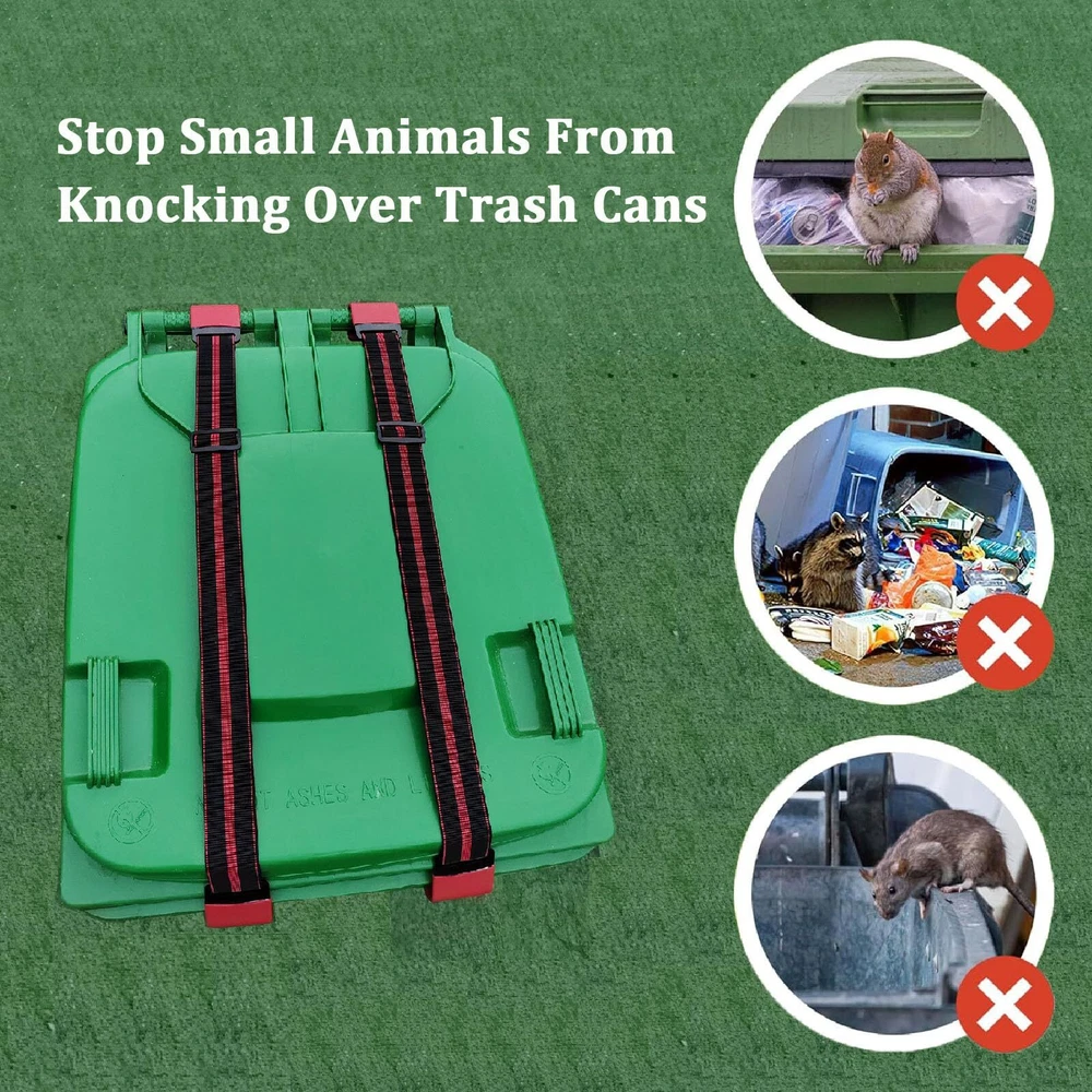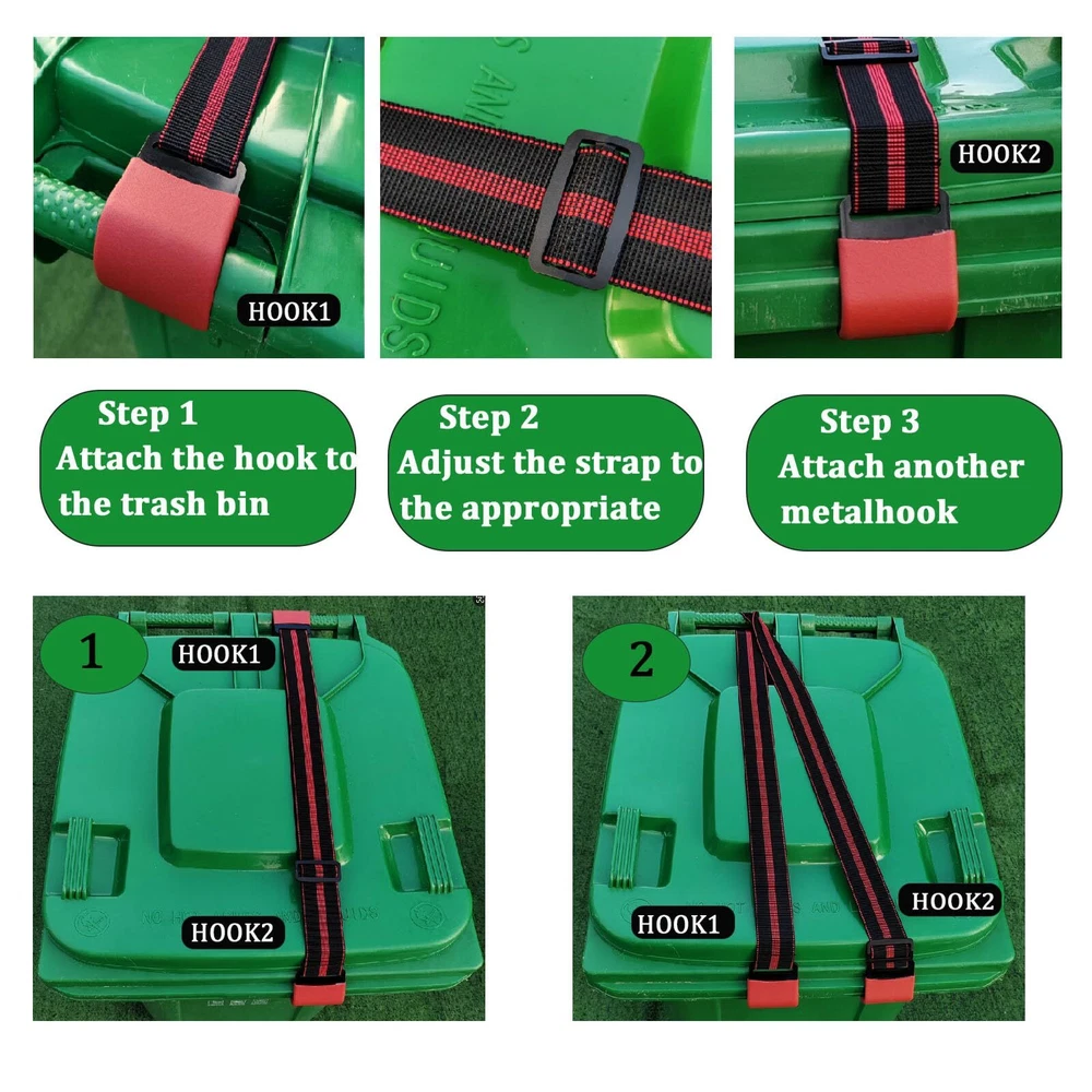 【Reliable Material】 The metal double claws of this animal trash can lock are made of heavy-duty metal hooks, and the elastic band is made of reliable polyester and latex rubber sinew, which are sturdy, robust, elastic, and not easy to destruction or wear. 【Adjustable strap】 The trash can lid lock can be adjusted from 25 inches to 48 inches. Double claws can be hooked at different positions in the trash can, suitable for most trash cans and becoming an perfect accessory for trash cans. 【Easy to install】 The trash can lid lock installation does not require bolts or fasteners, making it easy to install and saving time and effort. 【Protect your trash can】 This bear resistant trash strap can be used to secure the lid of the trash can, preventing raccoons, rats, dogs, and other animals from opening the lid and keeping your courtyard clean. 【Packaging content】 2 pick trash can lid lock