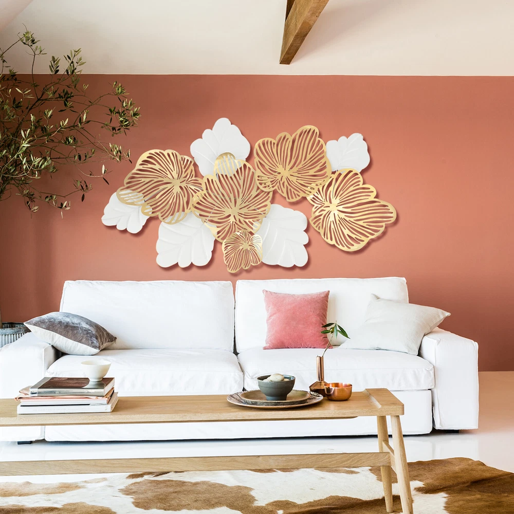 Metal Flower Wall Decor, 3D Gold Leaf Flower Decoration Modern Decor Wall Sculpt Description Everyone wants to have a beautiful and warm home. Our 3D metal wall art leaves will add some beauty to your home. It is made of hard and durable iron. The high-temperature baking paint gives it an exquisite and shiny look. The Scandinavian style makes it suitable for most home decoration styles. It is suitable for living rooms, bedrooms, hallways, galleries, cafes, restaurants, hotels, etc. Key Features Great Durability: This 3D metal wall decoration is made of hard and durable iron. It is also finished with an iron forging process, so it has a good quality with a long life span. Exquisite and Luxurious Appearance: The openwork carvings of gold flowers and white leaves give the wall decor a very luxurious and beautiful look. So it is a wonderful decoration for your room! 3D Decoration: Our 3D decoration is much more dimensional than many flat decorations. The 3D design makes the whole decoration look lifelike. Solid Structure: Each leaf of this wall decoration is welded and fixed to a metal rod . So the structure is very stable. The leaves are uneasy to deform and loose. Uneasy to Fade: This wall decoration has a high-temperature baking paint process. It stays that color for a long time. It looks new even after a long time of usage. Suitable Size: It measures 52*28inch. This size is suitable for many walls because it will not be too eye-catching and just be the finishing touch to the wall decoration. Easy to Install: This wall decoration is very simple to install. We have provided you with mounting screws. All you have to do is hang it on the wall with the screws. It is convenient and simple for you. Easy to Clean: This wall decoration is very convenient and labor-saving to clean. You can wipe the surface dust off with a towel. An Ideal Gift: This exquisite wall decoration is also a great gift. If your friends or family are having a housewarming, you can gift them this decoration. Guaranteed Customer Service: We aim to provide quality products and services. If you have any problems, please feel free to contact us. We will reply and solve the problem for you as soon as possible. Details Fine Workmanship: The golden flowers of this wall decoration are hollowed-out flowers, and the leaves are simulated leaves with real leaf textures. They make the wall decoration look very exquisite and lifelike. Smooth Surface: This surface of this decoration is finely polished and polished. So its surface is very smooth and shiny. Moreover, this decoration does not have sharp edges, so it's safer to use. Application It is suitable for living rooms, bedrooms, hallways, galleries, cafes, restaurants, hotels, etc. Specification Style: Scandinavian Style Color: White, Gold Material: Iron Exterior Paint Process: High-temperature Baking Paint Process: Wrought Iron Forging Gross Weight: 6kg/13.2lbs Product Size: 132*72cm/52*28inch Package Size: 135*75*6cm/53.1*29.5*2.4inch Installation Use a tape or straightedge to measure the product hook spacing, and then mark the point to be perforated with a pen. Use a 6mm/0.24in impact drill to punch holes in the marked center, the length of the drill bit is the length of the expansion cap. Hit the expansion cap. Use a hammer to hit the expansion cap into the location of the drilled hole Screwing. Use a screwdriver to screw the screws into the expansion cap, leaving a distance between the screw and the wall to hang this product. PACKAGE INCLUDED 1* 3D Metal Wall Art Leaves 10* Screws Notes Please be aware that the shelf should be installed on a solid wall, not on a hollow wall. Please allow the slight color difference caused by the shooting light and 1-3 cm error due to manual measurement, and make sure you do not mind before ordering. Payment Delivery details Terms of sales About us Contact us Payment We accept ebay payment 。 Fees such as import duties, taxes are not included in the item price or shipping costs. These charges are the buyer's responsibility. Delivery details Shipping: 2-9 working days to: USA Terms of sales We maintain high standards of excellence and strive for hundred percent customer satisfaction. Feedback is very important to us. We hope that you contact us immediately before you give neutral or negative feedback, so that we can address your concerns. It is impossible to address issues if we do not know about them! About us Your satis faction is our ultimate goal. We work hard to earn your trust and future business. Our certified technicians have tested each item before shipping. The unit comes with 1 year limited warranty on all manufacturing defects. a) If you receive a defective item, you may return it or ask for a discount. Please contact us within 14 days after you receive the package. b) What you returned must be intact and in its original packaging as re? u. Customer is responsible for shipping costs of the returned item. c) We will cover the cost of shipping back t with the shipping rate indicated in the registration page. We will send you a new unit or refund the full payment you paid. Thank you. Contact us Business Hour Business Hour: Monday To Friday: 8:30 AM to 5:00 PM (Beijing China time) Due to time zones, our reply to your questions may not be immediately. But within above working time, we will reply your email within 24 hours. If it's non-workdays, please kindly be patient and wait till Monday. Please contact us with ebay message. Please feel free to contact us if you have any questions. Monday To Friday: 8:30 AM to 5:00 PM (Beijing China time) Due to time zones, our reply to your questions may not be immediately. But within above working time, we will reply your email within 24 hours. If it's non-workdays, please kindly be patient and wait till Monday. Please contact us with ebay message. Please feel free to contact us if you have any questions. 1.Feature* Unique Appearance,Great Durability 2.Feature* Compact Design,Convenient Use Features : I