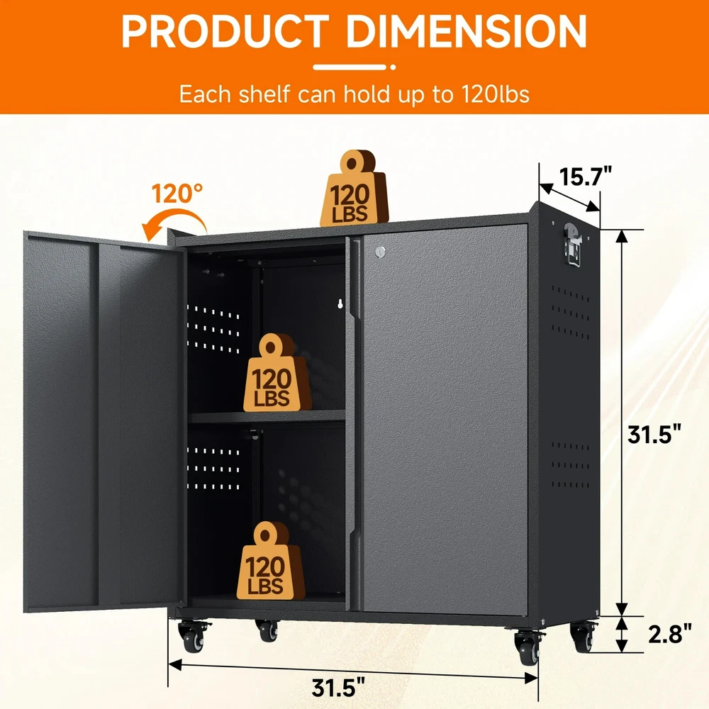 Metal Garage Storage Cabinet with Locking Doors and Adjustable Shelves,34.3" H Small Rolling Tool Storage Cabinet,Lockable Metal Tool Cabinet on Wheels for Garage, Warehouse, Barbershop-Black Gray About this item 🌟【STURDY & ENDURING】Crafted from sturdy cold-rolled steel, this sliding garage cabinets and storage system balances load-bearing strength with lasting endurance. There are 1 adjustable shelve and 2 tier storage space meet your needs to store different size items, each shelf of garage storage cabinets can load 120lbs. 🌟【MULTI-FUNCTIONAL SIDE HOLE DESIGN】In addition to being perfect for storing large quantities of items, the metal storage cabinets outside hanging hole design adds extra space to any room. An extra side rack can hold over drill bits in different sizes and styles and be a clean space for every handy stick-shaped tool like screwdrivers, pry bars, glue applicators, Etc. 🌟【360° SWIVEL SILENT CASTERS】Rolling tool cabinet was designed with 4 detachable and lockable 360° rotating casters, The tool cabinet with wheels can be easily moved to the desired location without lifting or carrying, thus providing convenient mobility and flexibility, making it a very practical storage and work tool. 🌟【SECURE STORAGE】Tool cabinet with doors adopts an upgraded version of the three-point lock system, and the steel rods are thickened to provide higher security for your valuables and important items. 2 keys included, which can be used by co-owners or as a backup in case of loss. 🌟【INSTALL AND SERVICE】Detailed parts labels and illustrated instructions are included in the package, you can also refer to the installation video to assemble and disassemble the practical metal garage cabinet easily. If you have any questions, please feel free to contact us, The 24-hour professional customer service team can help you in time. At a glance Brand Kooyon Material Metal Assembled product dimensions (l x w x h) 15.70 x 31.50 x 34.30 Inches Pieces 1 Finish Matte Number of shelves 1