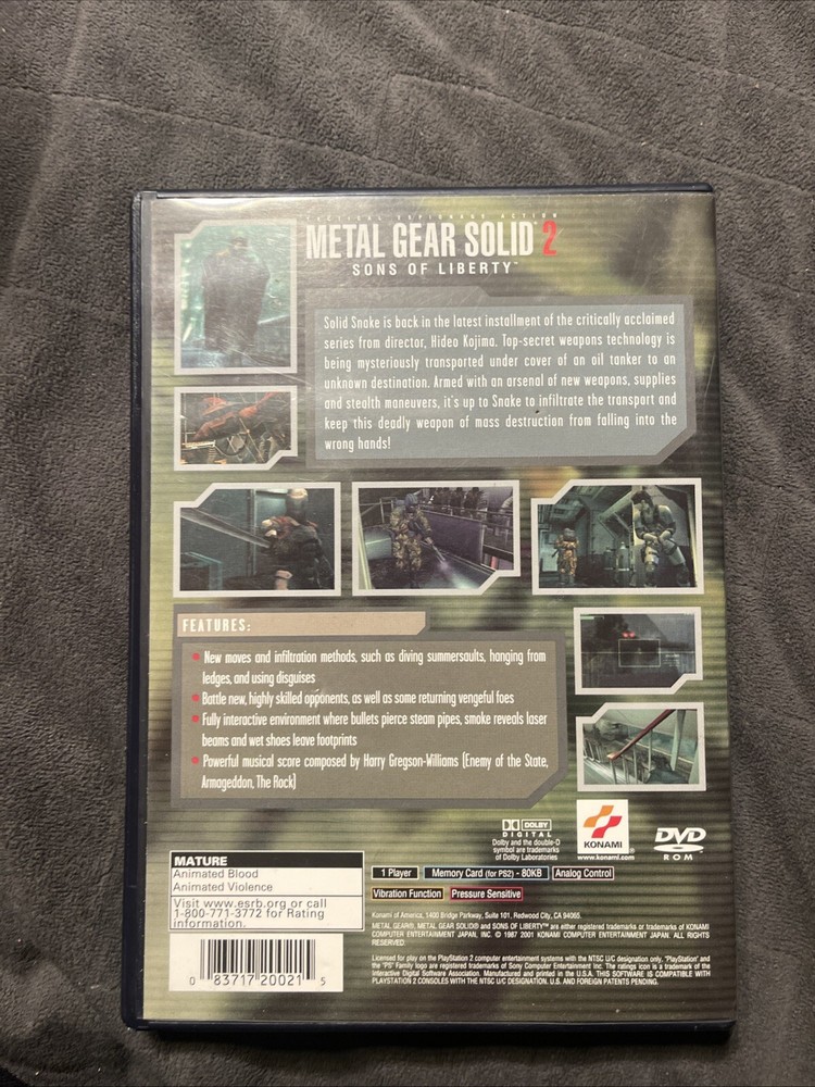 Rating:M - MatureVideo Game Series:Metal Gear SolidGenre:Action & AdventureGame Name:Metal Gear Solid 2: Sons of LibertyRegion Code:NTSC-U/C (US/Canada)UPC:0083717200215gtin13:0083717200215Platform:Sony PlayStation 2Publisher:KonamiMPN:SLUS-20144