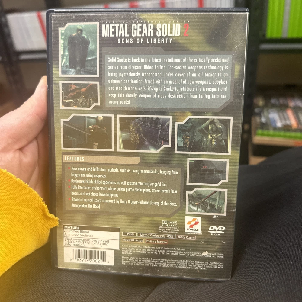 Rating:M - Maturegtin13:0083717200215MPN:SLUS-20144UPC:0083717200215Publisher:KonamiGenre:Action & AdventureVideo Game Series:Metal Gear SolidRelease Year:2001Game Name:Metal Gear Solid 2: Sons of LibertyPlatform:Sony PlayStation 2