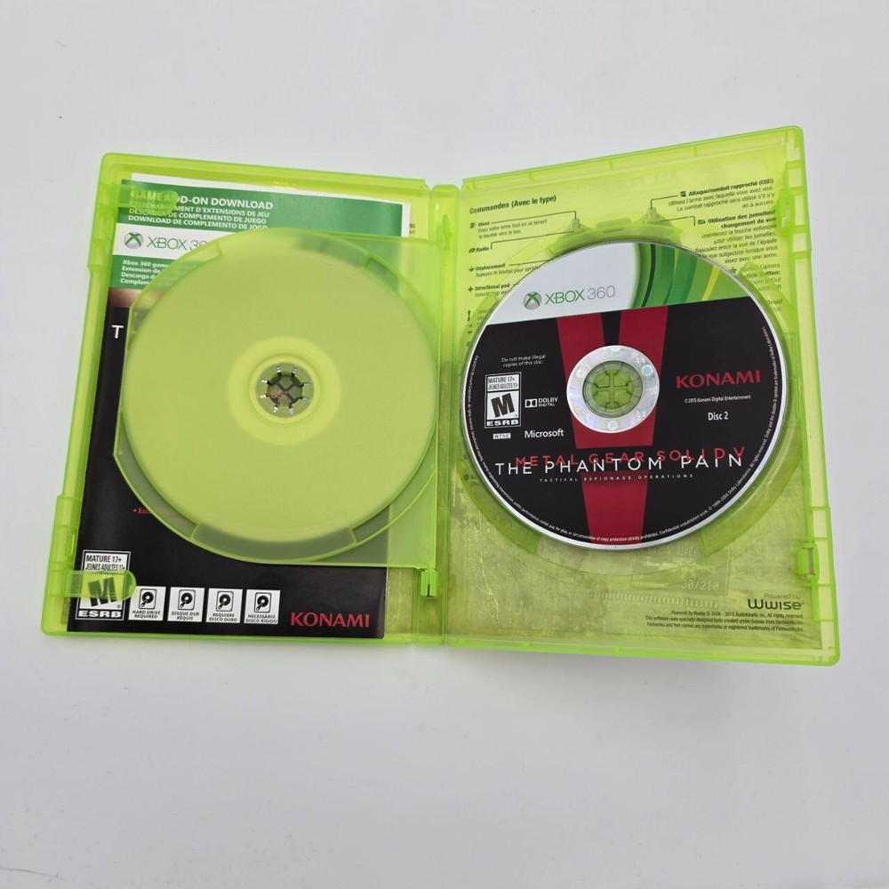 Game Name:Metal Gear Solid: The Phantom PainCountry/Region of Manufacture:United StatesFeatures:Manual IncludedRating:M - MatureRelease Year:2015Region Code:NTSC-U/C (US/Canada)Video Game Series:Metal Gear SolidPlatform:Microsoft Xbox 360Publisher:KonamiSeller Notes:“Used, but in good condition. Complete in box. Slight water damage to artwork. See pictures.”Genre:Action & Adventure, Fighting, Shooter