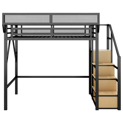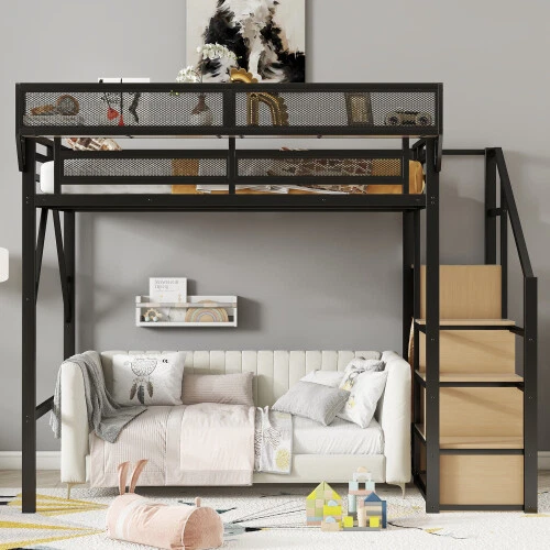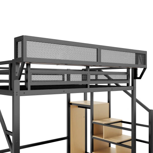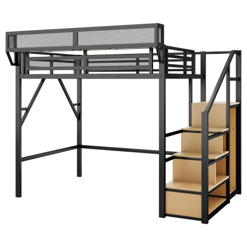 Metal High Loft Bed with Wardrobe Stairs Storage Shelf Full Queen Size Bed Frame [Loft Bed with Storage Shelves for Upper] The full/queen metal loft bed features a storage shelf next to the upper bed, providing extra storage space. This shelf is perfect for keeping books, gadgets, or small items within easy reach. The shelf have mesh around which prevent thing falling down. It adds functionality without compromising space. [Metal Loft Bed with Staircase] The metal full/queen size loft bed come with staircase includes built-in storage compartments, making it easy to store items like shoes, toys, or blankets. The steps ensure safe and convenient access to the upper bed, enhancing both practicality and safety. [Under Space of Metal Loft Bed] 54.3 inch under the full/queen loft bed creates extra space for multi-functional use. You can place storage cabinets, a small sofa, or a desk underneath, maximizing the use of limited space and creating a versatile living area. [Metal Loft Bed with Wardrobe] The staircase features a built-in wardrobe function, providing additional storage for clothes and accessories. This clever design adds more functionality to the metal queen loft bed, making it a perfect solution for small bedrooms. [Durable and Sturdy Construction] The full/queen size metal loft bed made from high-quality metal, this loft bed is durable and sturdy. The metal material ensures long-lasting use and stability, while also offering a sleek and modern look that fits well in any bedroom. Color: Black Material: Metal Overall Dimensions: Full:94.3” x 57.2”x 73.4” (L x W x H). Queen:99.4” x 63.4”x 73.4” (L x W x H). Size: Full/Queen Size Height of Upper Guardrail: 11.3" Clearance Under the Bed 54.3" Recommended Mattress Thickness 6”(not included) Weight Capacity: Full:350LBS; Queen:400LBS. Box Spring Required No Country of Origin China