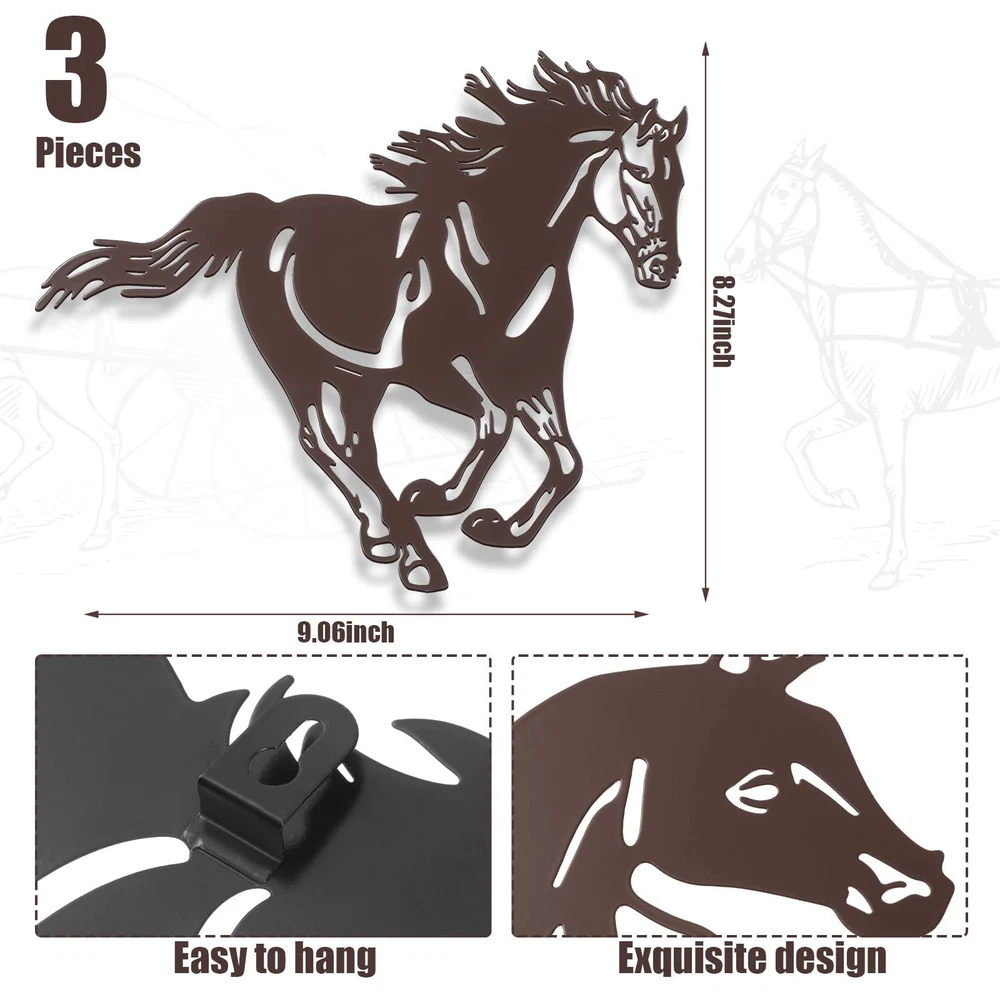 Features: Easy to hang and match: These metal horse decorations for wall have hooks on the back, which can be easily hung on the wall and can be matched well with your home style, whether your home is retro or modern style. Sweet gift: You can give these western horse wall decors as nice housewarming, birthday or festival gifts to your family, friends, or other people who love horse, readily enhancing relationship. Specifications: Material: metal Color: dark brown Size: approx. 9.2 x 8.5 inches Package includes: 3 x Metal horse rustic wall decors Notes: Manual measurement, please allow slight errors on size. The color may exist a slight difference due to different screen displays. Classic design: with flying whips and strong limbs, these 3 different horses on the metal western wall decor come running towards you, with rustic style and fine workmanship, classic and vivid, improving your overall decoration of your house Quality metal: each metal horse wall sculpture is made of metal material, strong and sturdy, reliable and reusable, not easy to deform and rust, with exquisite laser cutting technology to make them look lifelike, giving you a pleasant use experience Appropriate Size: these 3 metal galloping horses wall arts are with a similar size, about 9.2 x 8.5 inches, conspicuous enough for you to decorate your wall and get attention, giving your room an elegant look 3D shadow: when these metal galloping horses wall arts are decorated on the wall, some natural shadows can be displayed on the wall, making themselves look more three dimensional, just like running in the wind Wide Occasion: the horses western metal silhouette is suitable for various occasions, such as such as cabin, bedroom, living room, office, porch, garage, kitchen, garden, yard and more, a nice ornament to show your taste and brighten up your world
