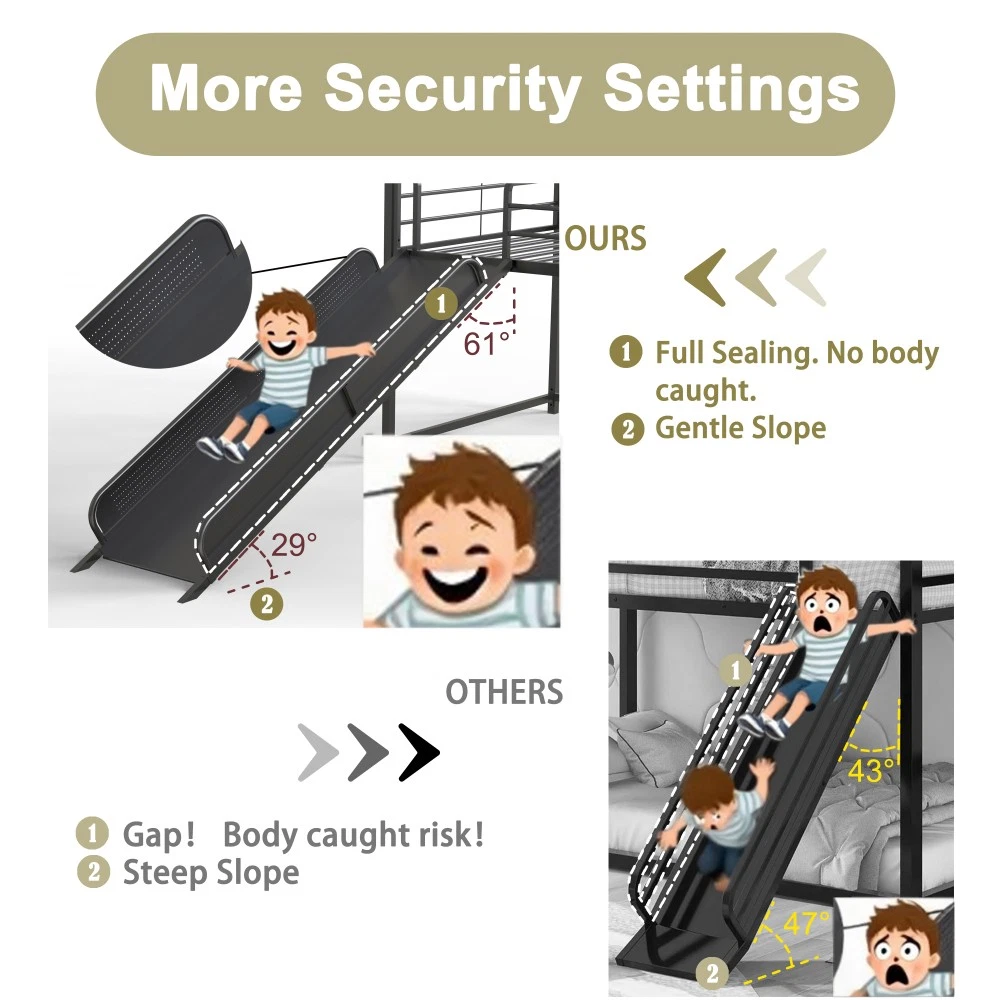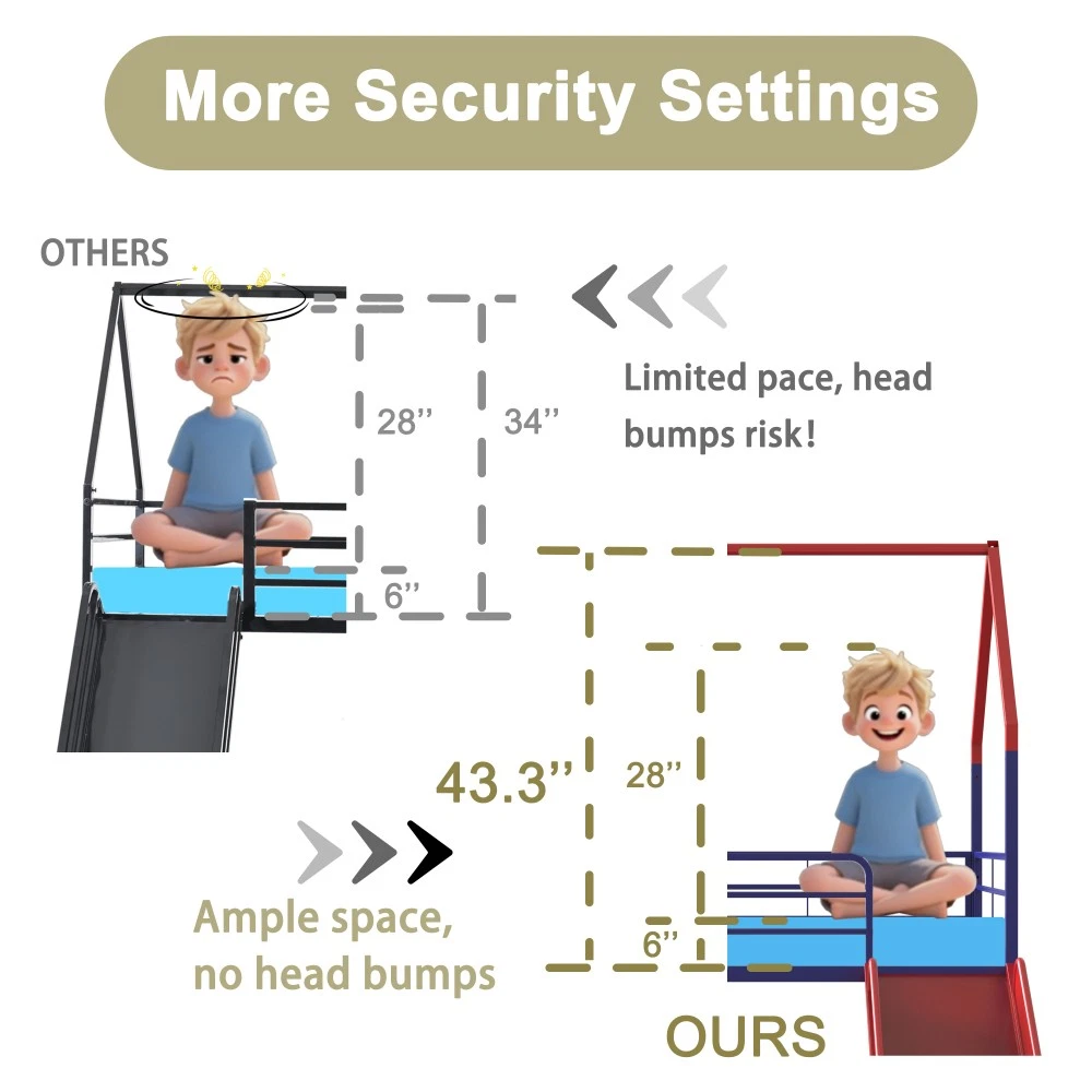 Origin: Malaysia | Color: Gold | Material: Metal | Style: Contemporary | Application: Bedroom Bed Specification: Twin Size | Bunk Type | Box Spring Not Required | Metal Frame 📏 Product & Package Dimensions Type Length (Inch) Width (Inch) Height (Inch) Weight (Lbs) Assembled Product 76.69 97.83 74.65 82.50 Package 79.13 15.94 7.28 92.80 ✨ Key Features Playful Haven for Imaginative Play: Turn your kid's bedroom into a fun sanctuary with this house-shaped bunk bed equipped with a smooth slide! Comes with a pennant banner flag and luminous star stickers for DIY decoration—let your child unleash creativity. The lower bed's curtain creates a cozy private nook, perfect for hide-and-seek or quiet reading, fostering imagination and a sense of security. Kid-Centric Safety Design: Safety is our top priority! This bunk bed features a fully sealed slide to prevent body parts from getting caught, smooth edges to avoid scratches during climbing, and a thoughtfully designed under-bed area that reduces the risk of head bumps. Reinforced guardrails keep your little one safe while sleeping, creating a secure space for play and rest. Superhero-Inspired Color Scheme: Elevate the bedroom with Marvel-inspired colors! Choose from Spider-Man red, Captain America blue, or Iron Man gold (this one is Gold!). These vibrant hues spark kids' interest and fit perfectly with superhero-themed decor, making it a favorite for boys and girls. Space-Saving & Multi-Functional: Maximize bedroom space with the clever bunk design! The lower area can be used as a play zone, storage space, or even a reading corner—turning your child's room into a versatile area that grows with them. Sturdy & Noise-Free Construction: Built with a heavy-duty square tube metal frame, this bed offers exceptional stability and supports up to 350 lbs. Exclusive all-around mute buckles fix the slats firmly, preventing noise from slat movement or tossing and turning—ensuring a quiet night's sleep for the whole family. Easy Assembly & No Box Spring Needed: Comes with clear step-by-step instructions and a helpful assembly video. All parts are labeled for hassle-free setup. 20 sturdy metal slats provide strong mattress support, eliminating the need for a box spring and preventing mattress sagging. Mattress Recommendation: For safety and comfort, use a mattress that is 74"-75" long and 37.5"-38.5" wide. Mattress thickness should not exceed 6" (minimum 4" recommended) and must be at least 5" (127 mm) below the upper edge of the guardrails. 🛡️ Our Guarantee 1-Year Quality Warranty: We stand behind our product! Enjoy a 1-year warranty against manufacturing defects. If you encounter any quality issues, our customer service team is here to help. 30-Day Free Return & Exchange: Not satisfied with your purchase? Enjoy a 30-day free return and exchange policy (terms apply). Shop with confidence! Note: Due to manual measurement, there may be a slight difference in dimensions. Color may vary slightly due to lighting and monitor settings. All accessories (slide, curtain, pennant banner, luminous stickers) are included in the package.