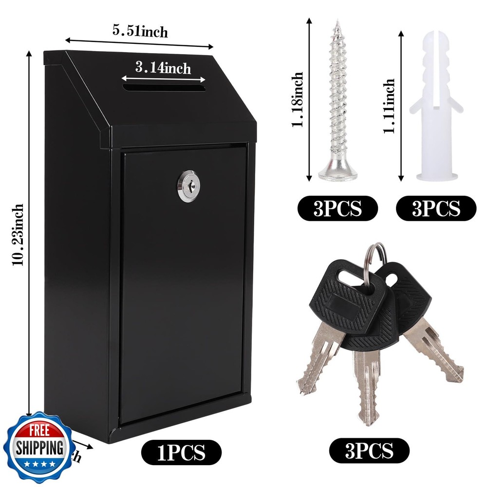 Metal Donation Box with Lock Ballot Box Drop Box with Lock Suggestion Box with Slot and Lock Metal Lock Box Comment Box Voting Box Key Drop Box for Home Office(Black,10.24 x 5.71 x 2.95 Inch) Features Perfect Size: Includes one Metal Donation Box with two keys, measuring 10.24 x 5.71 x 2.95 inches (26 x 14.5 x 7.5 cm). Its compact size saves space while providing convenience for your home. Premium Material: Made of high quality metal, this outdoor lockable mailbox is sturdy, weather resistant, rustproof, and deformation-free, ensuring long-lasting performance for secure mail storage. Easy Installation: Pre drilled holes on the back allow for hassle free mounting. Simply use nails or hooks to hang it on walls, doors, fences, or other surfaces for quick setup and easy use. Thoughtful Design: Key drop box features a rainproof top cover to keep water out, a small slot for easy mail delivery, and a front keyhole for secure and convenient access to stored items. Versatile Use: Designed with a compact size and pre drilled holes, this drop box with lock is perfect for hanging on walls, doors, or fences, offering flexible placement options to suit your daily needs. Shipping Free & Fast Shipping: We offer free shipping to most of the USA with a normal delivery time of 3-7 days. However, due to the current situation, additional delivery time (up to 3 weeks) may be required for some items. Alternative Carriers: We may use alternative carriers (e.g., USPS, FedEx, UPS) to ensure your package arrives safely and on time. Due to the use of multiple carriers, we are unable to provide a tracking number automatically. Handling Time: Orders are processed and shipped within 1-2 business days of receiving cleared payment. Shipping Restrictions: Shipping to Alaska, Hawaii, Puerto Rico, Guam, and other US territories may incur shipping charges or delivery restrictions. Please contact us before ordering, or your order can be refunded/cancelled. State Restrictions: Certain items may not be shipped to California due to state regulations. Contact for Tracking Updates: If you require tracking updates or have any concerns about the delivery of your order, please feel free to contact us, and we will be happy to assist you. Return Policy 30-Day Hassle-Free Returns: If you are not completely satisfied with your purchase, you can return the item for free within 30 days of receiving it for a full refund or exchange. Easy Return Process: Contact us, and we will provide you with a prepaid return shipping label and detailed instructions. No Restocking Fee: There are no restocking fees for returns. However, the buyer is responsible for return shipping costs if the return is not due to a seller"s error. Refund Processing: Refunds will be processed within 1 business day of receiving the returned item in its original condition. Feedback Your feedback is extremely important to us. We strive to provide the best products and customer service possible. If you are satisfied with your purchase, please take a moment to leave us a positive review. If you have any concerns or issues with your order, please contact us before leaving negative feedback. We are committed to resolving any problems and ensuring your satisfaction. Contact Us If you have any questions or concerns, please feel free to reach out to our customer support team. You can contact us through the eBay messaging system. We are available Monday to Friday, 9:00 am to 5:00 pm EST, and we will do our best to respond to your inquiry within 24 hours. Thank you for supporting our small family business!