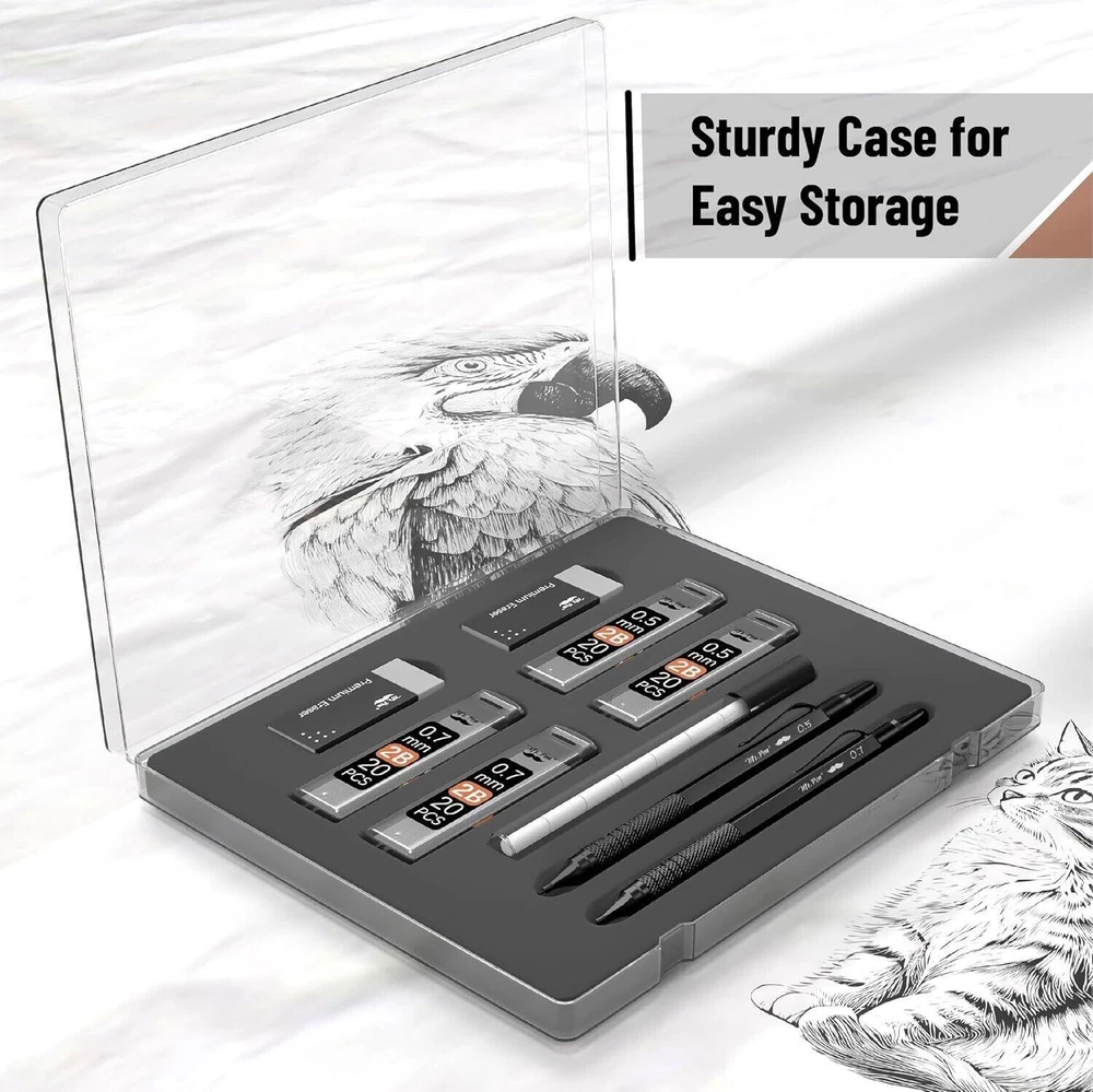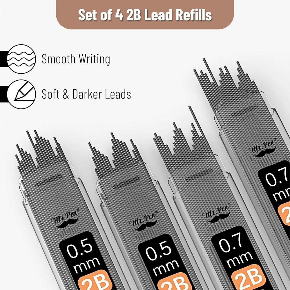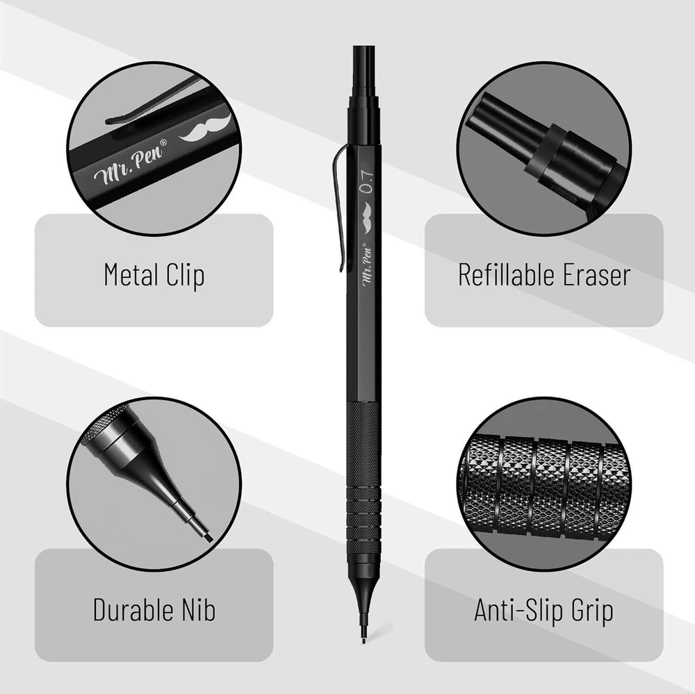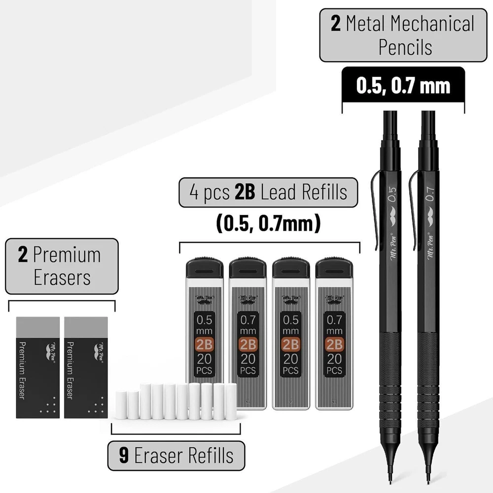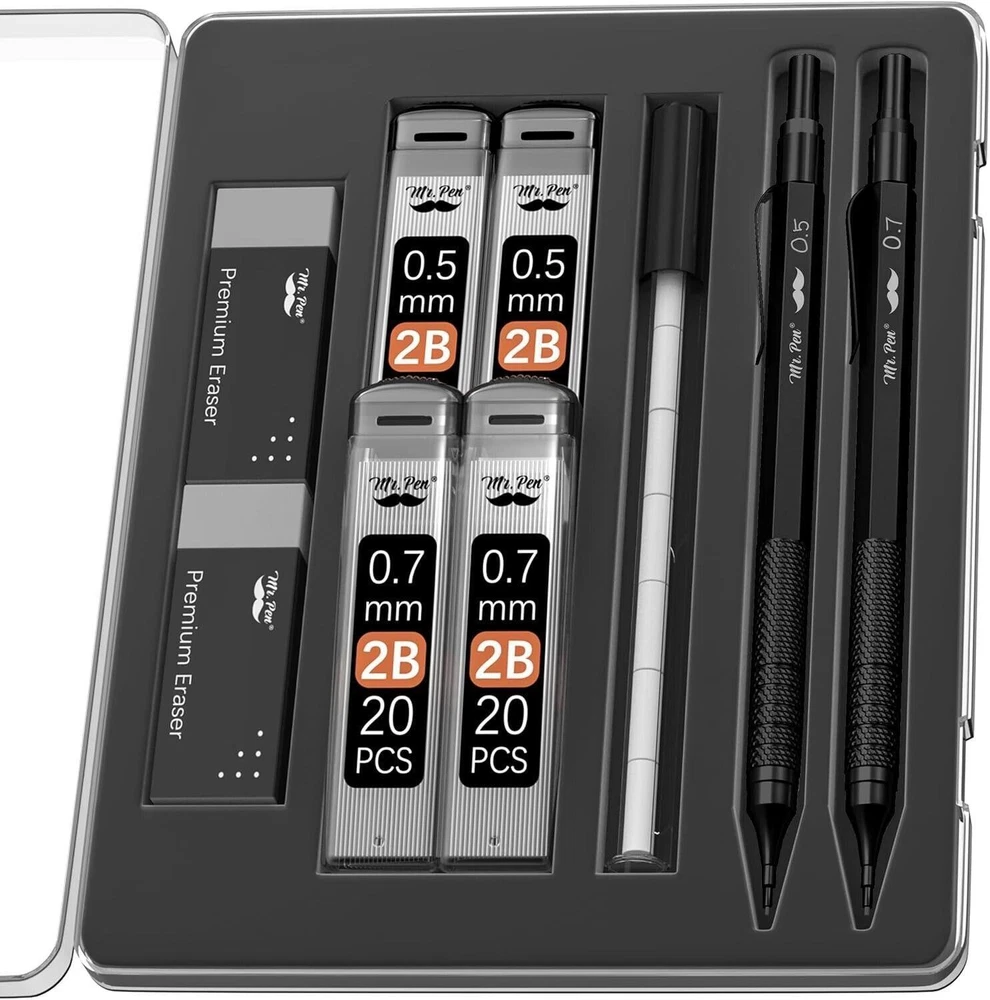 CONTACT US DIRECTLY FOR FREE & PREPAID RETURNS - Metal Mechanical Pencil Set, 2 Sizes, 0.5 & 0.7mm, Mechanical Pencils, Sketchi Mr. Pen metal mechanical pencil set includes 2 premium mechanical pencils in sizes 0.5mm and 0.7mm, perfect for precise writing, drawing, and technical tasks. The set comes with 80 pieces of high-quality 2B lead refills, with 40 refills each for 0.5mm and 0.7mm sizes, ensuring long-lasting use and consistent performance. Constructed from durable metal, these mechanical pencils offer a sturdy and comfortable grip, enhancing the writing experience and reducing hand fatigue during extended use. The set also includes 2 premium erasers and 9 eraser refills that effectively remove pencil marks without smudging, keeping your work clean and professional. All items are neatly organized in a compact, portable case, making it easy to carry and store your mechanical pencils and accessories, ideal for students, professionals, and artists alike. REVIEWS The product came very well packaged. I'm very happy. thank you for everything. Seller strongly recommended. This is great! I definitely recommend! Product looks amazing Delivery was fast. Excellent seller, great communication. I advise everyone