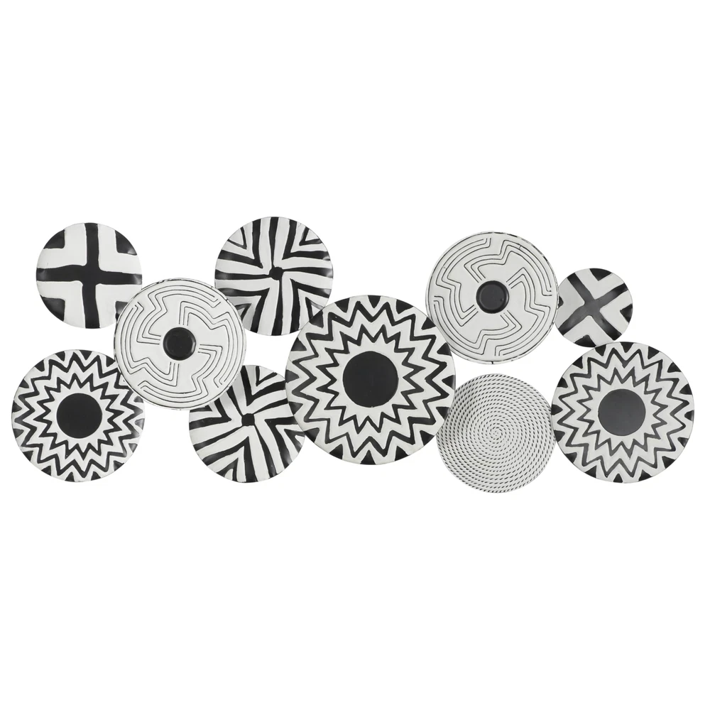 Each plate in this contemporary room wall decor is meticulously crafted with various paint patterns welded together to form irregularly shaped silhouette. Matte black wall art for living room has an intriguing irregular shape, consisting of ten-disc structures adorned with pattern prints. Wipe clean with a dry cloth. As a plate wall sculpture, it serves as a suitable accent piece for corners needing a touch of pattern or modern flair. This item ships in 1 carton. Can be hung horizontally or vertically using the metal rings; nails and screws not included. Suitable for indoor use only. This item ships fully assembled in piece. This is a single black colored wall sculptures. Contemporary style. CONTEMPORARY DECOR FOR WALL: Embrace artistic expression with a style that highlights bold designs with sleek lines, neutral elements, and a minimalist aesthetic METAL WALL HOME DECOR: Crafted from solid iron, the black home wall decor is both durable and visually striking BLACK AND WHITE WALL ART FOR LIVING ROOM: Round decor for wall presents an elegant matte black finish, with each disc carrying a unique black and white color scheme PLATE ROUND ROOM WALL DECOR: Iron wall decor features a cluster of monochrome plates in an overlapping arrangement, offering an abstract yet contemporary appeal SMALL SIZE WALL ROOM DECOR: The black metal wall decor measures 50L x 1W x 19H inches, and weighs 4 lbs