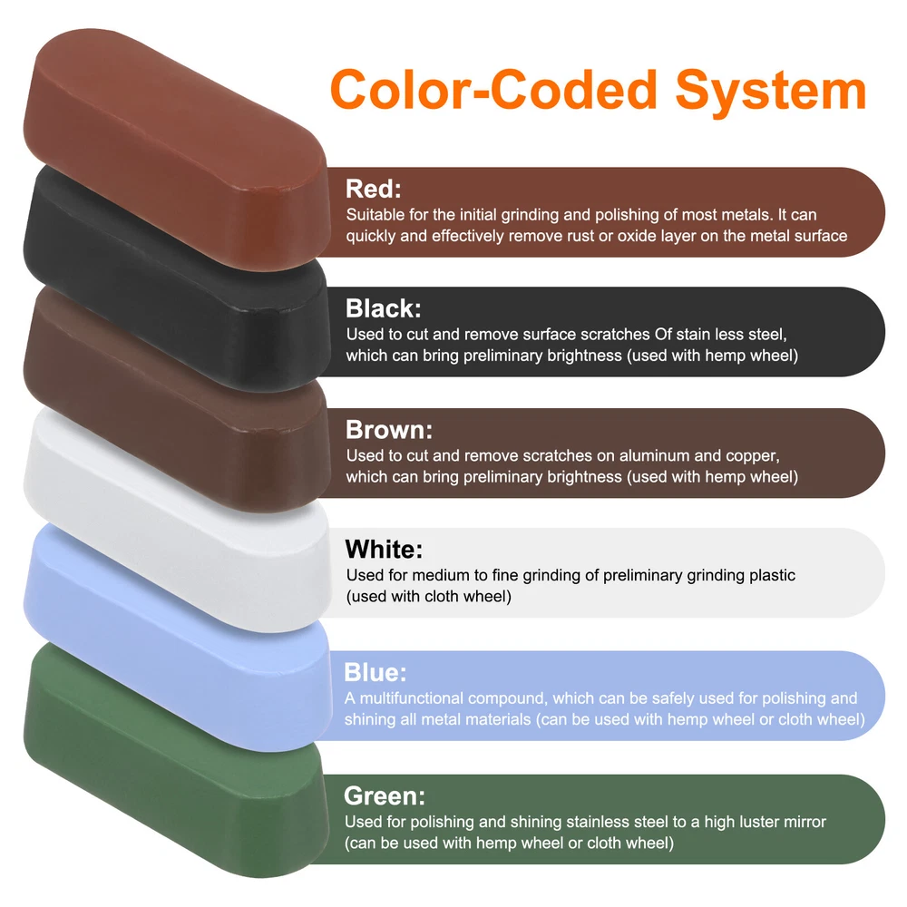 Document The polishing compound bar is crafted to bring metal or non-metallic surface back to smooth and shining finish.Our buffing compounds feature distinct colors to denote varying degrees of abrasive, facilitating instant recognition. Apply from coarse to fine grits to unleash the optimal shine and finesse on metal surfaces, thereby elevating their aesthetic appeal. Thoughtfully crafted in a rectangle shape for strong grip and handling comfort during prolonged polishing tasks.Good for polishing stainless steel, copper, aluminum, chrome metals, wood, jade, and more, enhancing their luster and smoothness.Effortlessly enhance surfaces with our buffing compound bar, specifically designed for seamless integration with polishing wheels. Gently apply the compound to a buffing wheel to release the polishing agents. Next, affix the workpiece to the rotating polishing wheel, achieving an efficient surface finishing process.Prior to application, ensure the workpiece is ground to a sufficient level of flatness to optimize the performance of the polishing wax, leading to good results. Metal Polishing Compound Bars, 1oz, Green The polishing compound bar is crafted to bring metal or non-metallic surface back to smooth and shining finish. Our buffing compounds feature distinct colors to denote varying degrees of abrasive, facilitating instant recognition. Apply from coarse to fine grits to unleash the optimal shine and finesse on metal surfaces, thereby elevating their aesthetic appeal. Thoughtfully crafted in a rectangle shape for strong grip and handling comfort during prolonged polishing tasks. Good for polishing stainless steel, copper, aluminum, chrome metals, wood, jade, and more, enhancing their luster and smoothness. Effortlessly enhance surfaces with our buffing compound bar, specifically designed for seamless integration with polishing wheels. Gently apply the compound to a buffing wheel to release the polishing agents. Next, affix the workpiece to the rotating polishing wheel, achieving an efficient surface finishing process. Prior to application, ensure the workpiece is ground to a sufficient level of flatness to optimize the performance of the polishing wax, leading to good results. Hot Item Payment 1.We accept eBay payment . 2.Payment must be received within 7 business days of auction closing. Shipping 1.We ship to your eBay or Paypal address. Please make sure your eBay and Paypal address is correct before you pay. 2.Items will be shipped within 1-3 business day when we received payment. 3.Delivery time depends on destination and other factors. Description Policy Metal Polishing Compound Bars, 1oz, Green The polishing compound bar is crafted to bring metal or non-metallic surface back to smooth and shining finish. Our buffing compounds feature distinct colors to denote varying degrees of abrasive, facilitating instant recognition. Apply from coarse to fine grits to unleash the optimal shine and finesse on metal surfaces, thereby elevating their aesthetic appeal. Thoughtfully crafted in a rectangle shape for strong grip and handling comfort during prolonged polishing tasks. Good for polishing stainless steel, copper, aluminum, chrome metals, wood, jade, and more, enhancing their luster and smoothness. Effortlessly enhance surfaces with our buffing compound bar, specifically designed for seamless integration with polishing wheels. Gently apply the compound to a buffing wheel to release the polishing agents. Next, affix the workpiece to the rotating polishing wheel, achieving an efficient surface finishing process. Prior to application, ensure the workpiece is ground to a sufficient level of flatness to optimize the performance of the polishing wax, leading to good results. Hot Item Payment 1.We accept eBay payment . 2.Payment must be received within 7 business days of auction closing. Shipping 1.We ship to your eBay or Paypal address. Please make sure your eBay and Paypal address is correct before you pay. 2.Items will be shipped within 1-3 business day when we received payment. 3.Delivery time depends on destination and other factors.