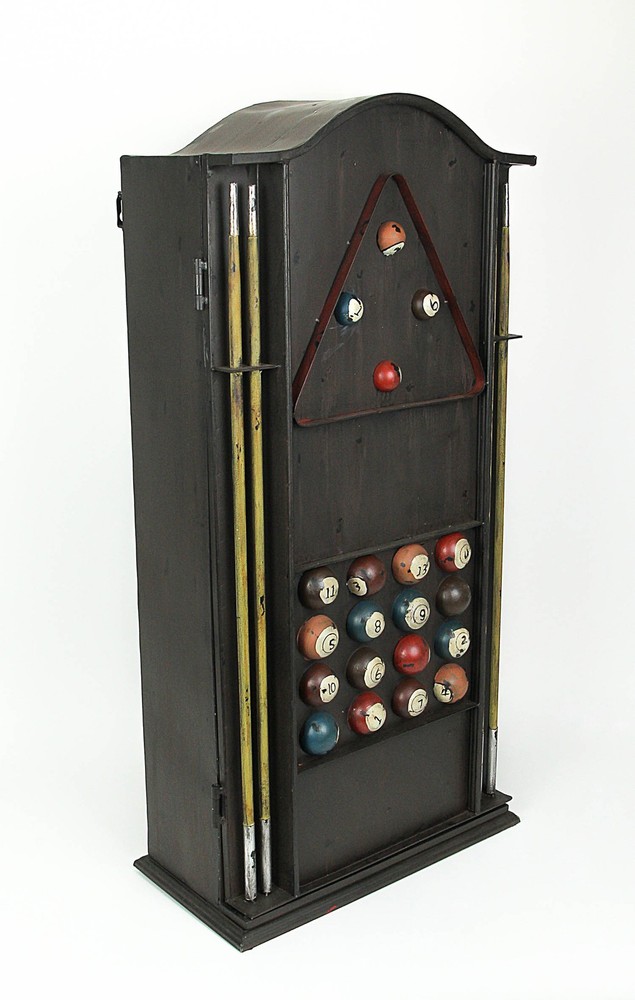 This stylish Pool Table Cabinet is creatively made from metal and designed with a decorative billiards theme. The multicolored finish is distressed to give it a vintage vibe. It measures 25 Inches tall, 9 Inches wide, and 18 inches long. It's a great piece to decorate a bar and is perfect for entertainment rooms. It makes a great gift. Our eBay Store About Us Add to Favorite Sellers Distressed Finish Black Metal Billiards Pool Table Tabletop Wall Mounted Cabinet 25 in. High, 18 in. Long, 9 in. Wide Made of Metal with Decorative Pool Game Details On the Front Multi-Colored Distressed Finish A Stylish Piece Perfect for a Bar or Entertainment Room Makes A Great Gift This stylish Pool Table Cabinet is creatively made from metal and designed with a decorative billiards theme. The multicolored finish is distressed to give it a vintage vibe. It measures 25 Inches tall, 9 Inches wide, and 18 inches long. It's a great piece to decorate a bar and is perfect for entertainment rooms. It makes a great gift. Product Details Color Multicolored Height 25 Length 18 Weight