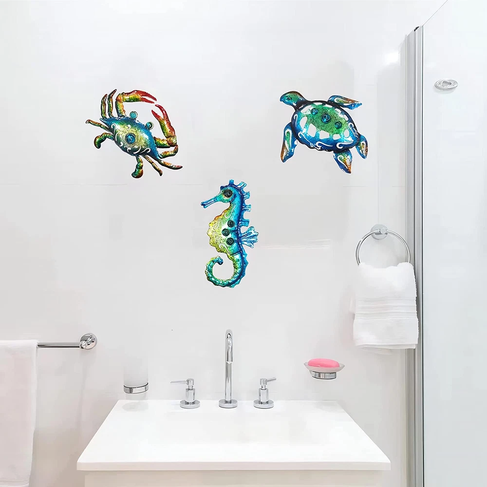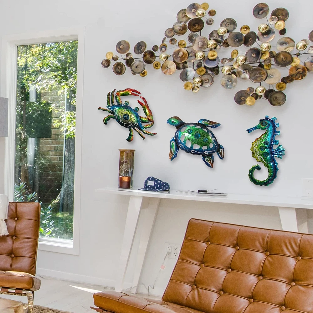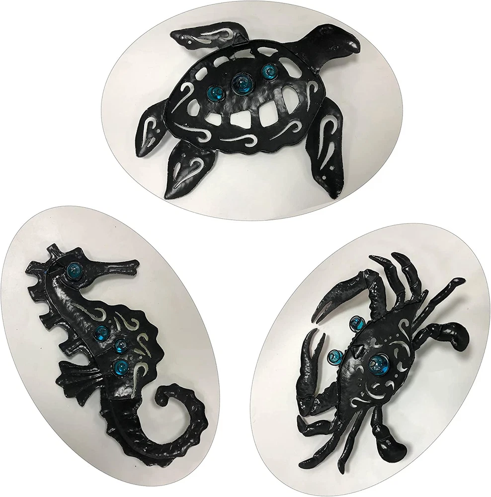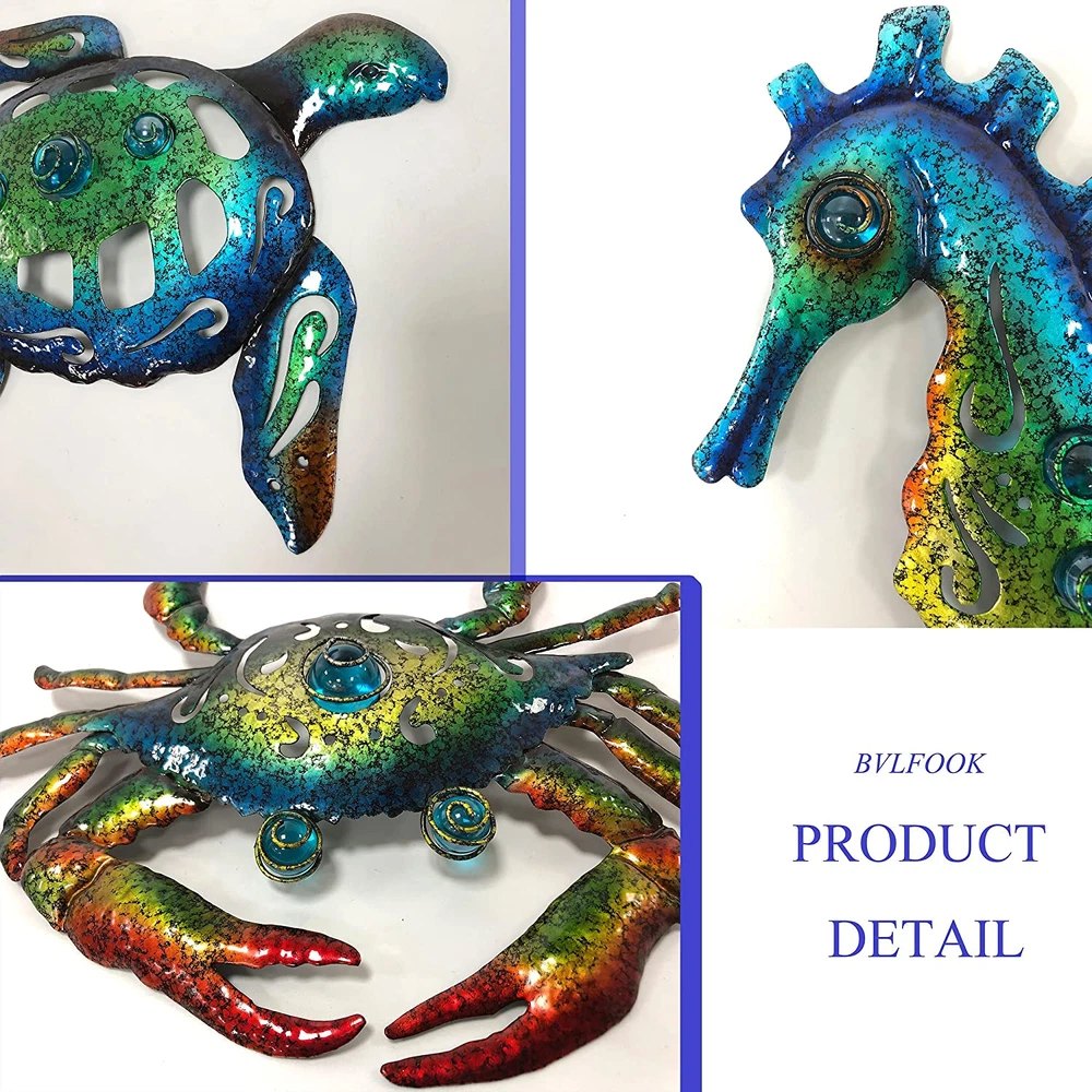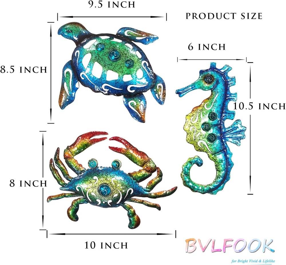 【Turtle decor】: Elevate your décor with our unique 3D wall sculpture inspired by the beach. The excellent workmanship and vivid painting, along with the amazing craquelure effect, make it a stunning addition to any room or patio. And, it's a perfect gift for family and friends. 【High quality craftsmanship】: Our ocean-themed décor is made of durable metal that is shiny, glossy, waterproof, anti-rusted, and easy to clean, ensuring that it lasts a long time. 【Easy to operate】: The sculpture measures 10 inches by 8 inches, which can easily fit on an A4 paper. It comes with a hook on the back, making it easy to install. 【Widely used】: This nautical tropical coastal wall décor can be placed anywhere you like, whether it's in the bathroom, bedroom, fence, patio, indoor or outdoor. It's also a perfect gift for birthdays, Christmas, or any other special occasions. 【Thoughtful service】: We strive to provide the best customer service, and if for any reason you're not 100% satisfied, please let us know, and our customer service team will be happy to assist you with a return or refund. Product Description Metal Marine Decoration The sculpture is made of metal and features a turtle, seahorse and crab traveling together as a group. The finish consists of different shades of blue-green and each piece is unique. It is as easy to hang on the wall as a painting. Marine life wall decoration unique shaped 3D wall sculpture. Excellent workmanship, vivid painting with amazing craquelure. Decorating you room and patio, satisfy your family and friends as gifts. The video showcases the product in use. The video guides you through product setup. The video compares multiple products. The video shows the product being unpacked. Bathroom wall decor Excellent workmanship, vivid painting with amazing craquelure. Decorating you room and patio, satisfy your family and friends as gifts. Metal wall decor wall hanging decor This blue-green ocean art surface features a unique process that gives it a distinctive vintage crackle pattern, giving the three sea creatures a vintage period look. We recommend this beach wall art for a nod to the ocean theme. metal wall art Decorate these 3D shaped turtles more vividly than ordinary paintings, with a procession of turtles crabs and seahorses exploring the area around your home This ocean wall art comes with hooks for wall display and is suitable for everyone who has dreams of tropical beach themed home decor. Home Decor This metal beach themed wall art is a good ideal design for Living Room, Bathroom, Bedroom, Wall, Walkways, Entrances, Patio and Indoor Decor. Delicate beach theme turtles decor has been masterfully crafted from metal. Giving the perception of lovely creatures that have rest on your wall. Each marine wall hanging above the use of acrylic beads to do embellishment decoration, so that it has a more 3D sense of three-dimensional. The unique craft technique is used to give it a unique chamfered surface, which looks more time-honored. Patio decorations In order to make its products last longer, we use anti-rust coating on the surface so that the turtle metal wall art can stay with your home longer. However, it will still inevitably rust after long exposure in a humid environment. Like-type comparison Add to Cart Customer Reviews 4.7 out of 5 stars 726 4.7 out of 5 stars 531 4.7 out of 5 stars 726 4.7 out of 5 stars 531 4.7 out of 5 stars 726 4.7 out of 5 stars 531 Price $18.39 $ 18 . 39 $16.79 $ 16 . 79 $16.79 $ 16 . 79 $16.79 $ 16 . 79 $14.83 $ 14 . 83 $14.99 $ 14 . 99 Material Metal Metal Metal Metal Metal Metal color Oceanic assemblage Tropical fish Shell Octopus Turtle Anchor Size 9.5 Inch 9 Inch 8.5 Inch 9 Inch 9.5 Inch 9 Inch Used Widely Outdoor,Indoor,Farmhouse Outdoor,Indoor,Farmhouse Outdoor,Indoor,Farmhouse Outdoor,Indoor,Farmhouse Outdoor,Indoor,Farmhouse Outdoor,Indoor,Farmhouse Customer Rating — — — — — —