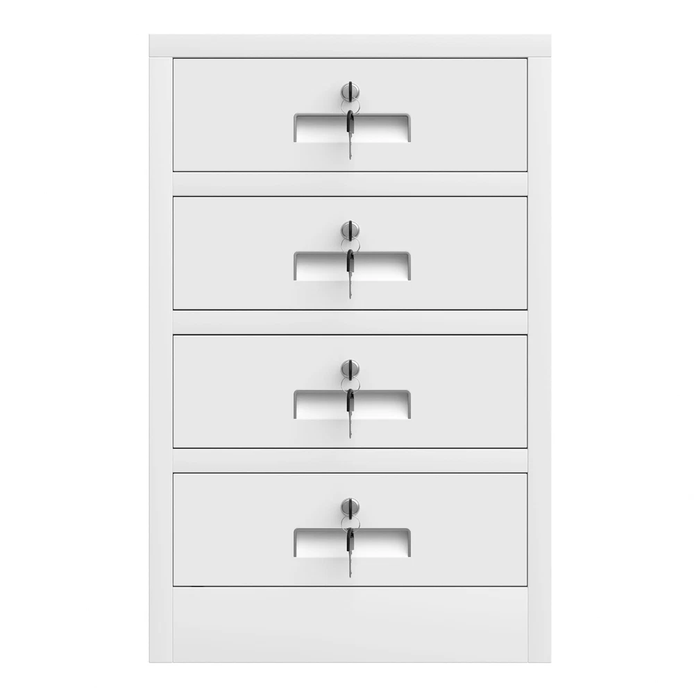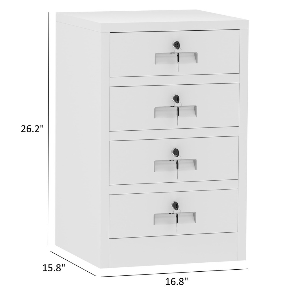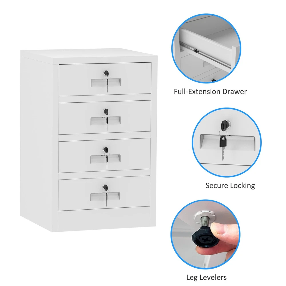 Product Details Material: Alloy Steel Surface finish: Odorless, pollution-free and recyclable powder coating Reinforced box construction makes the storage cabinet sturdy and durable Easy-to-clean interior due to smooth compartment floor Product Dimensions: 15.8"W x 16.8"D x 26.2"H Package Dimensions: 28.4" x 20" x 4.7" Overall Package Weight: 43 Lbs Overall Product Weight: 33 Lbs In the box 1 lockable metal storage cabinet 2 keys x 4 sets 4 Leg levelers 2 Spare parts kit for Installation 1 Assembly Instruction LOCKABLE DRAWERS - This metal storage cabinet is designed with 4 lockable drawers for securely storing away office supplies, valuables, files, makeups and any small items THOUGHTFUL DESIGN - This storage cabinet comes with adjustable feet to avoid moisture transfer and floor scratching, the legs can be replaced with stem casters (thread diameter: 5/16") VERSATILE FUNCTIONALITY - This small cabinet with locking drawers can be used as an office cabinet under/beside table, as a nightstand for bedroom or as an endtable for living room STACKABLE TOP - The top of this 4 drawer metal cabinet is designed with large loading capacity, it is an ideal open storage solution for holding printer or displaying decors and plants STURDY AND DURABLE - Built with powder coated metal and reinforced construction, this lockable drawer cabinet has been designed to be solid and hard-wearing EASY TO ASSEMBLE - This small drawer cabinet arrives flatpacked and can be built up easily with an included assembly instruction and a step-by-step assembly video