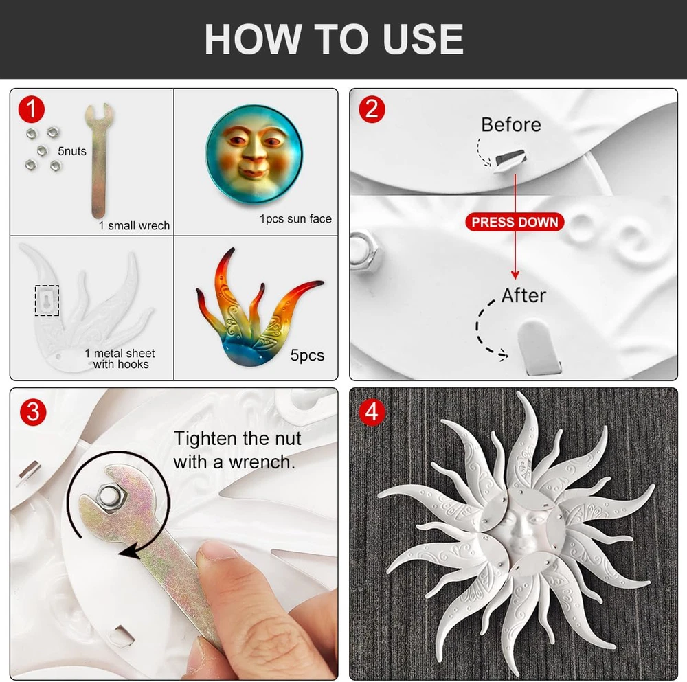 ???????Unique Design???: The metal sun wall art is an ideal choice for wall decorations, which can bring a sense of design and art to your home. This sun decor made of high-quality metal materials, are carefully crafted by hand, with exquisite workmanship and bright colors, adding a touch of color to your space. ???Excellent Decoration???: The metal sun wall decoration is very suitable for indoor and outdoor use, adding a unique style to your garden, yard, balcony, living room, bedroom, etc. It can also be used as a gift for family and friends. ???Easy to Install???: The metal sun wall decoration comes with a sturdy metal hook, making it easy to install on the wall or ceiling. You can easily install it in a few minutes according to the installation instructions we provide. ???Idea Gift???- Metal artwork can be used as a gift for anniversary, Valentine's Day, Mother's Day, Labor Day, Thanksgiving Day, Christmas and other holidays. It is the best gift for those who love gardening, decoration and life. ???Customer Service???-Since each product is handmade, there may be slightly flawed and imperfect, please understand. If you are not satisfied with our products, please feel free to contact us, all of our products provide easy return and exchange services
