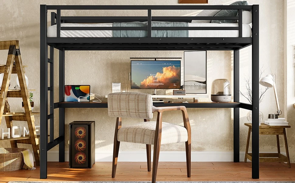Metal Twin Size Loft Bed with Power Outlet and LED Lighted, Space-Saving Bed Features [Loft Bed with Desk]The loft bed can be configured as two separate spaces.Not only can meet the need for rest, while for work or leisure to provide more personal space. This loft bed comes with a desk used for work or study and a power output in front of the desk,creates a productive, simple work,study or gaming area for your child. Perfect for space-saving needs. [Loft Bed with USB and LED] The loft bed's desk comes with a USB charging station for charging electronics that is convenience to your daily life.The DIY smart light comes with a variety of light modes, so feel free to design your light show and create a dreamy bedroom atmosphere. [Sturdy Metal Frame] Made of solid metal frame, the loft bed is durable and reliable for you bedroom.All four sides of the upper bed are equipped with protective guardrails to prevent little ones from accidental falls to keep them safe and secure during play or sleep. [Security certificate protection] This loft bed has passed the children's product certificate (CPC) test to protect your child from accidental injuries. [Easy Assembly] This Metal Loft Bed comes with clear instructions that will guide you through all steps. Each part is numbered and has a clear manual, with all tools included for easy installation. Overall Product Dimension:77.6"L x 41.7"W x 68.9"H Descriptions Description The loft bed can be configured as two separate spaces.Not only can meet the need for rest, while for work or leisure to provide more personal space. This loft bed comes with a desk used for work or study and a power output in front of the desk,creates a productive, simple work,study or gaming area for your child. For families with limited space, this is a practical and stylish piece of furniture that can meet their needs.The DIY smart light comes with a variety of light modes, so feel free to design your light show and create a dreamy bedroom atmosphere. Description & Dimensions Product Type Metal Loft Bed Size Twin Product Material Metal Color Black Overall Product Dimension 77.6"L x 41.7"W x 68.9"H Overall Product Weight 75.40LBS Detail Product Dimension Please refer to the Size image Package Dimension 1 Weight Capacity 350LBS Recommended Mattress Thickness 6'' Assembly Required Yes Country of Origin China Notes Manual measurement has been used, there may be some reasonable error. All the pictures are taken by actual samples, slight chromatic aberration may occur due to lighting