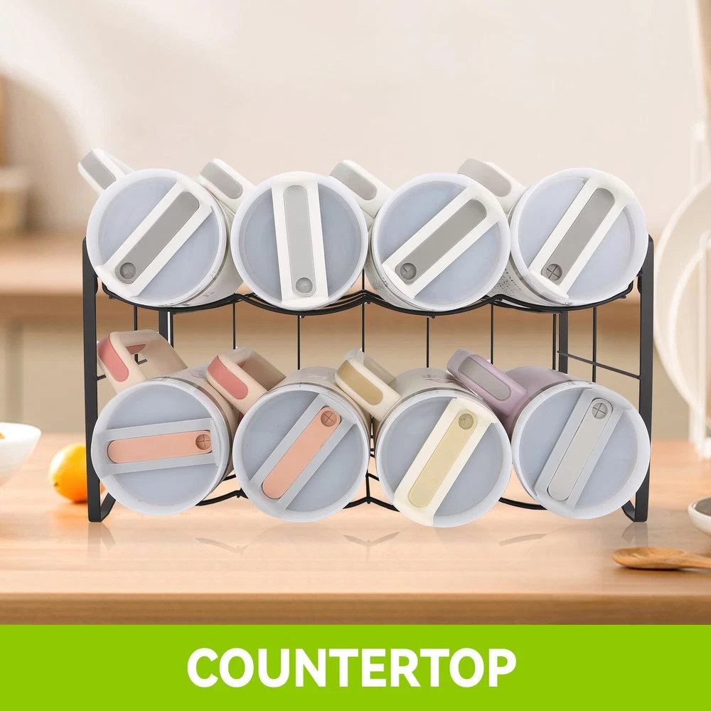Water bottle organizer: Our water bottle storage rack has 2 layers, each layer can hold up to 4 40oz water bottles, and is equipped with 2 cup lid hooks. It can save desktop space and is very suitable for storing Stanley water bottles, wine bottles, children's milk bottles, sports water bottles, and shake bottles. Perfect design: The curve design can more perfectly place Stanley water bottles, wine bottles, and sports water bottles without shaking. The hook design can place cup lids, brushes, etc. Iron metal material: The entire water cup storage rack is made of metal, making it more sturdy and more load-bearing. Durable is the only choice for storage racks. Multifunctional storage organizer: Our water bottle storage rack is very suitable for places with limited space. It is suitable for adding vertical storage space in various environments such as kitchen countertops, food storage rooms, cabinets, refrigerators, bathrooms, study rooms, and utility rooms. Good choice of water bottle organizer: Not only is the material made of metal anti-rust and stronger load-bearing, but the overall design is closer to the water bottle itself. If you have any questions during use, please contact us in time.