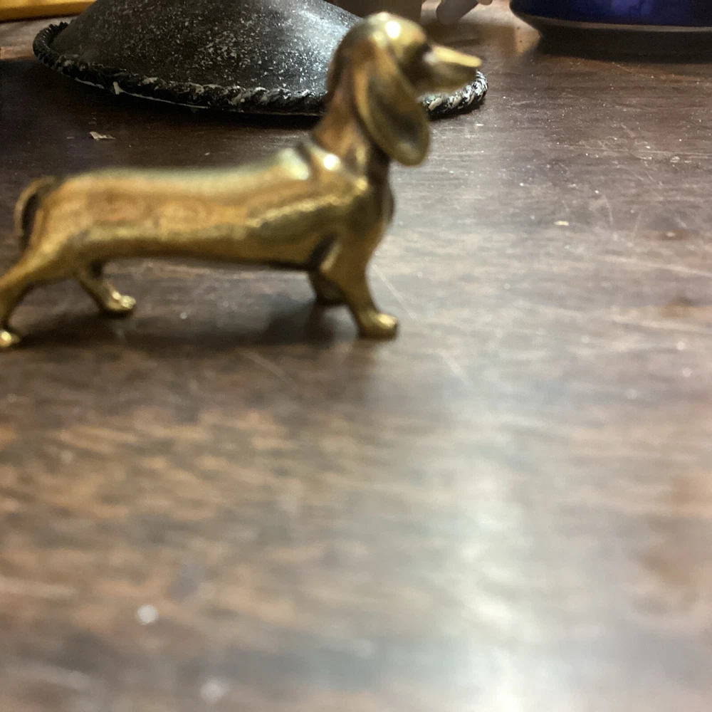 This is a small figurine of a Dachshund, also known as a wiener dog. It is made of brass or metal, but the exact material is unsure. The figurine is handmade and could be a collectible item for those who love Dachshunds.