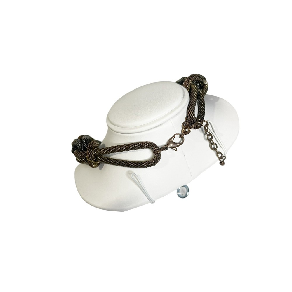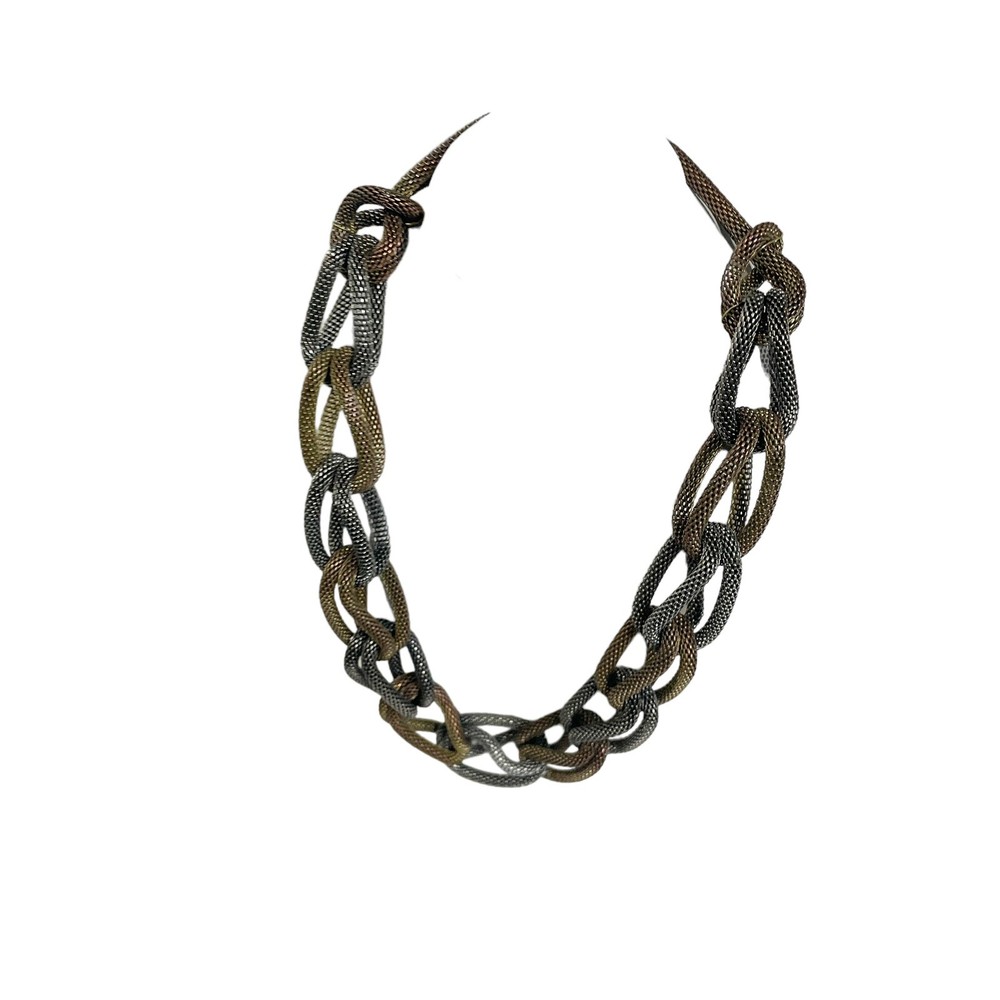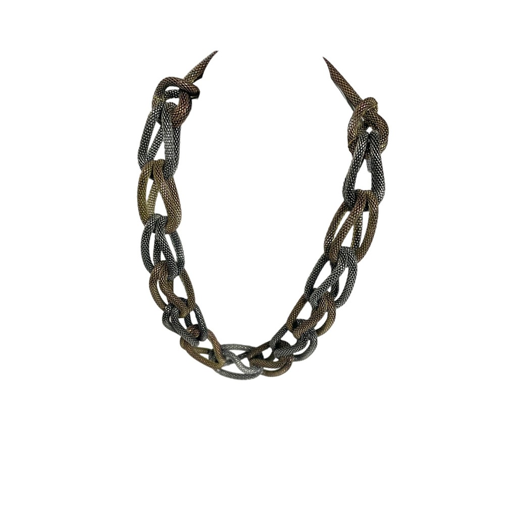 This metallic chunky chain link twisted necklace is a timeless piece that will elevate any outfit. With an adjustable lobster closure, this 17 inch necklace is perfect for any occasion such as Mother's Day, Christmas, Graduation, Anniversary, Father's Day, Birthday, Christening, Confirmation/Communion, or Valentine's Day. The gold color and link chain style give off a trendy fashion and costume vibe that is perfect for any vintage or antique lover. The necklace is made of an unknown metal material, but is signed by the seller and has a yes warranty. It is not personalized or customized, making it a great gift for anyone. The necklace is also sizeable and has no main stone, making it the perfect accessory for any outfit. Feel confident and stylish with this metallic chunky chain link twisted necklace. In very good condition All Measurements Are Approximate Please email us with any questions! ** LIKE THE ITEM BUT NOT THE PRICE, REASONABLE OFFERS ACCEPTED We stand by our clothing items and strive to make every purchase perfect, please reach out if you have an issue with an order before leaving negative feedback Every Purchase Gets Us closer to our dream of a brick and mortar store!!!