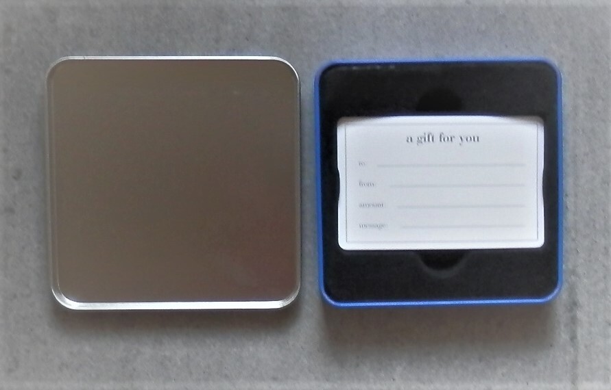 You are bidding on: Gift Card Gift Tin/Box Metallic Circles Design With Gift Card Holder + Gift Tag size: square with about but not exactly: 4 in x 4 in original seal and never open or used