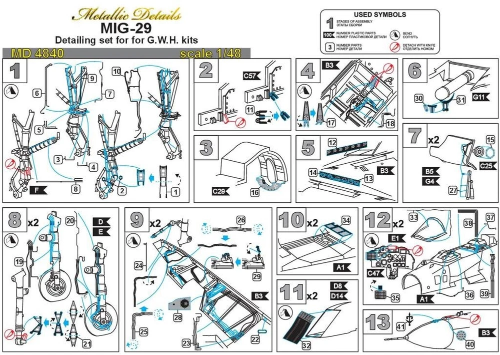 MD4840 MiG-29. Exterior Scale: 1:48 Manufacturer: Metallic Details (Ukraine) Country/Region of Manufacture: Ukraine Paint: Unpainted, Unassembled, Kit do not contain paints and glue. Condition: New in Box Features: Kit Set contains photoetched parts for detailing of exterior, landing gears, air intakes and cockpit for aircraft model. "The MiG-29 (NATO: Fulcrum) - a twin-engine jet fighter aircraft, designed by Mikoyan Design Bureau. Produced: 1981 – present. Operators: Algeria, Azerbaijan, Bangladesh, Belarus, Bulgaria, Chad, Czech Republic, Eritrea, Germany, Hungary, India, Israel, Kazakhstan, Malaysia, Moldova, Myanmar, Peru, Poland, Romania, Russia, Serbia, Slovakia, Turkmenistan, Ukraine, United States, Uzbekistan, Yugoslavia" The figures are not painted!!! ----------- This is a plastic model kit. Assembly and painting is required. Paint and glue is NOT included. Item Type: Scale model kit Commodity Attribute: Assembly The model is a plastic assembly model and needs to be assembled and painted by yourself You need an extra purchase of the glue, paint and so on!