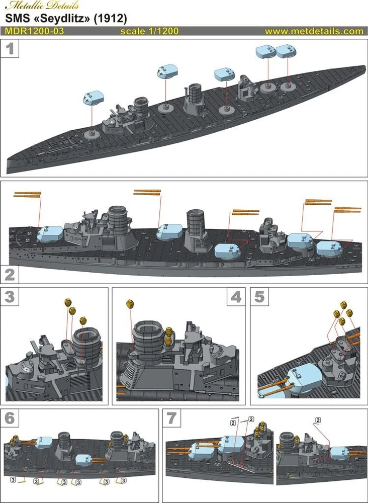 Metallic Details MDR1200-03 Scale 1:1200 photoetched and 3D-printed parts for detailing of ship model "SMS Seydlitz" This 1:1200 scale photoetched and 3D-printed parts set is the perfect way to add detail and realism to your SMS Seydlitz model ship. The set includes a variety of parts, including guns, turrets, and deck details. Product Features: Scale: 1:1200 Manufacturer: Metallic Details Country of Origin: Ukraine Condition: New in Box Features: Kit Set includes: Photoetch, 3D-printed Advantages: High-quality photoetched and 3D-printed parts Detailed and realistic design Easy to assemble Perfect for adding detail to your SMS Seydlitz model ship The parts are made from high-quality photoetched and 3D-printed material and are designed to be easy to assemble. With this set, you can add the level of detail and realism to your SMS Seydlitz model ship that you've always wanted. Order your 1:1200 scale photoetched and 3D-printed parts set for SMS Seydlitz Model Ship today!