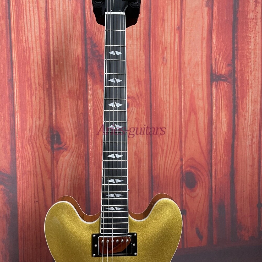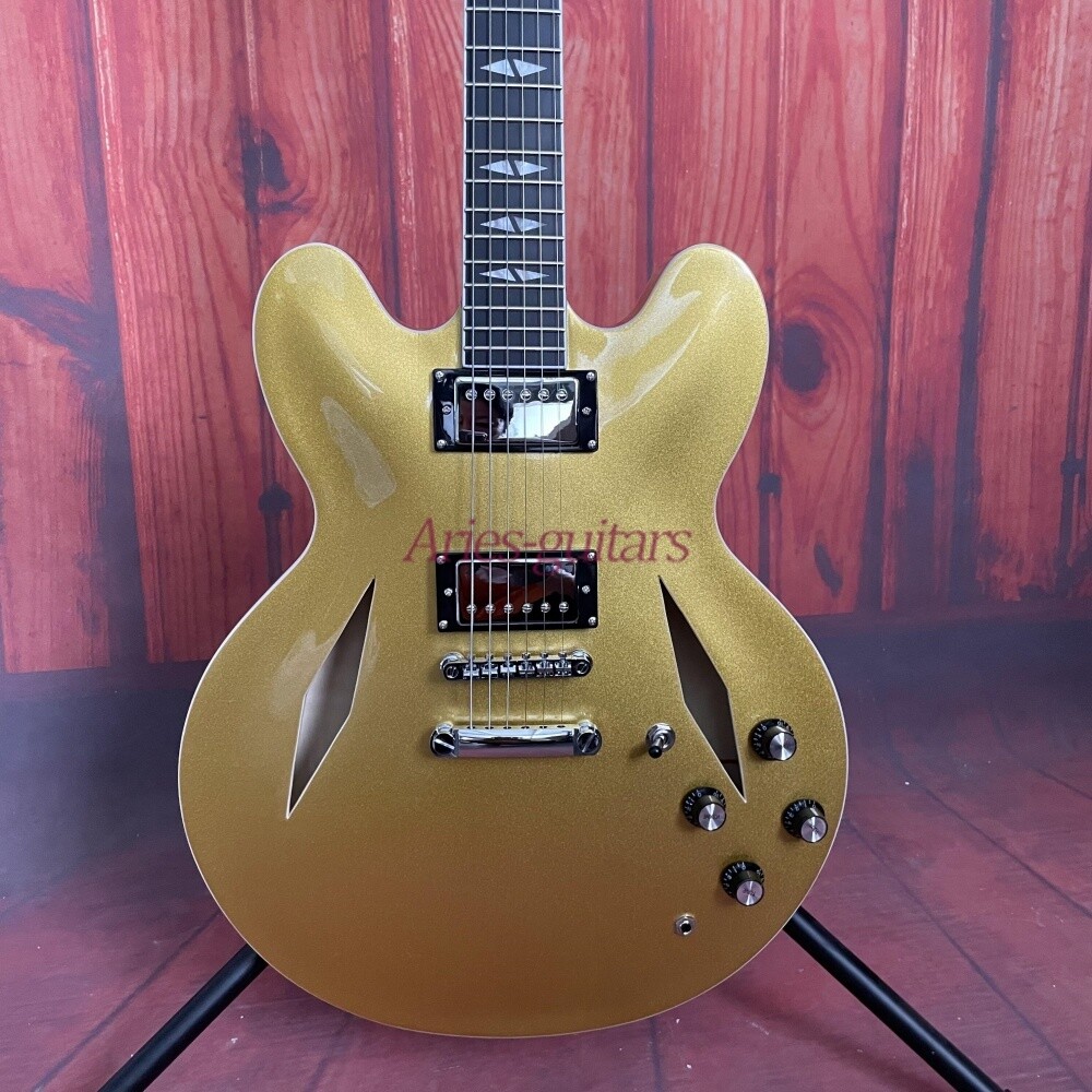 Metallic Gold DG-335 Maple Semi Hollow Body Electric Guitar HH Pickup in Stock Body: Maple Neck: Mahogany Fingerboard: HPL Frets: 22 Pickups: H-H Bridge: Fixed Hardware: Chrome Joint: Set in Package: 1x Guitar Please Note: Each of our guitars is handcrafted, ensuring individual uniqueness. ♪ Wood grain, texture, a nd color might slightly vary from the images. Customer Service Commitment We are a guitar factory from China. Many of our guitars are sold to Europe, North America, South America, Australia,etc. We believe we can offer you high quality guitars with reasonable price. If you want to customize the guitar or get a unique guitar, please let us know. We can build a guitar as per your requirements, except during busy factory seasons. ♫ Please be aware that our quoted prices do not cover any customs fees or other buyers responsible taxes. ♫ Our 30-day return policy means you can shop with confidence. For any purchase issues, contact us within 3 days of receipt. We are committed to a smooth exchange/return/refund process and ensure professional packaging for safe transit. ♫ Return Process Need just a part? We can send it directly. For returns due to damage or defects, initiate the process on eBay, keeping the product in its original condition. ♬