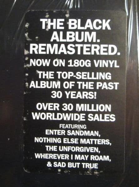 Metallica - Metallica (LP) (180g Vinyl) Format: Vinyl LP Record Cat No: Blackened Recordings BLCKND008R-1 TVF Code: HRM01592 Grading: M/M (Sealed) Other Comments: 2021 Reissue. Double LP. Remastered. 180g Vinyl. Stickered Gatefold Sleeve. Brand New And Sealed. Tracks: Side A 1. Enter Sandman 2. Sad But True 3. Holier Than Thou Side B 1. The Unforgiven 2. Wherever I May Roam 3. Don't Tread On Me Side C 1. Through The Never 2. Nothing Else Matters 3. Of Wolf And Man Side D 1. The God That Failed 2. My Friend Of Misery 3. The Struggle Within