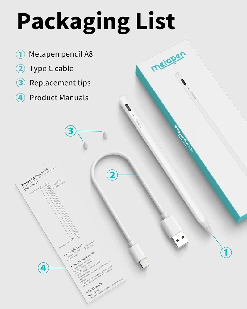 【Make Sure Your iPad Model is Compatible】: Metapen Pencil A8 is ONLY compatible with the iPad 2018-2024 series models: NEW 2024 iPad Air 11-inch & 13-inch (M2), iPad Pro 11-inch & 13-inch (M4), iPad 10/9/8/7/6 Gen, iPad Air 3/4/5 Gen, iPad Pro 11 inch 1/2/3/4 Gen, iPad Pro 12.9 inch 3/4/5/6 Gen, iPad Mini 5/6 Gen. NOTE: The Pencil A8 is NOT compatible with iPad models before 2018, iPhone, Android and Microsoft devices. Please check your product model before placing an order 【Quick Connect and Double Magnets】: No need to connect to Bluetooth or APPs. Double-tap the top of the pen (Invisible touch switch) to turn it ON/OFF for a quick connect. With two built-in magnets, the Metapen iPad Pen is always ready to firmly attach to your iPad at any time, no more rolling and lost. NOTE: Wireless Charging is NOT Supported. NO Magnet Attach for iPad Pro M4, iPad Air M2, iPad Air 3rd Gen, iPad 6th/7th/8th/9th/10th Gen, iPad mini 5th 【Tilt-sensitive and Palm Rejection】: Different angles create different lines and shadows on screen. Tilt for the shadow in [pencil brush] or tilt for thicker lines in [Marker brush]. Our ipad stylu supports with Palm Rejection. No longer glove, you can rest your palm or fingers on the screen during sketching, drawing and writing 【More Durable Tips】: Made of high quality polymer material, the Metapen‘s tips pass the 20 km tip durability test -- 2X more durable than the original iPencil's tips. Its internal structure remains always intact after 3000 times impacts. In addition, each Metapen A8 pen comes with two extra replaceable tips , much cost-saving for users with high frequency pencil tips 【2X Faster Charge】: Metapen Pencil A8 can be fully charged in just 30 minutes with USB-C and run for up to 10 hours. Charge 1 min = work 50 mins, charge 4 mins = work 2 hours. The LED indicator shows different colors according to the power, reminding you to charge in time. Automatic shutdown after 5 minutes of inactivity for efficient energy saving 【0.1 mm Pixel Precise Without Delay】: The upgraded smart chip gives the pen a pixel-level accuracy of up to 0.1 mm, high sensitivity, no breakpoints and no delay. You can just enjoy writing small words and drawing fine lines with ease, just like a real pencil! NOTE: The iPad stylus does not have a pressure sensitive design Brand Metapen Color White Material Metal Number of Batteries 2 Lithium Polymer batteries required. (included) Item Weight 0.53 Ounces Battery Average Life Standby 365 days Compatible Devices NEW 2024 iPad Air 11-inch & 13-inch (M2), iPad Pro 11-inch & 13-inch (M4), iPad (6th, 7th, 8th, 9th and 10th Gen), iPad Air (3rd, 4th, and 5th Gen), iPad Pro 11-inches (1st, 2nd, 3rd and 4th Gen), iPad Pro12.9-inch (3rd, 4th, 5th and 6th Gen), iPad Mini (5th and 6th Gen) See more Item dimensions L x W x H 6.53 x 0.35 x 0.35 inches Are Batteries Included Yes Batteries Required? Yes Manufacturer Metapen Are Batteries Required Yes Brand Name Metapen Model Number ME-APP152 6972190