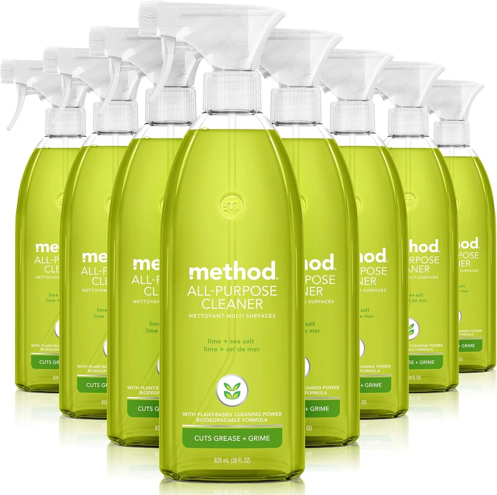 Contains (4) 28 ounce spray bottles of all purpose surface cleaner This all-purpose surface cleaner spray puts the hurt on dirt. Biodegradable formula with plant-based cleaning power cuts through grease + grime. Cleans most non-porous surfaces including counters, tile, stone, wood and glass. Cruelty free. Tested by people, not on animals. Bottle (minus nozzle) made with 100% recycled plastic (PCR). Lime + Sea Salt scent is for everyone who loves sunshine, spring break and margaritas. So, everyone. Proudly doing business with a purpose. Grease and grime don't stand a chance. Not with powerful, plant-based cleaning agents in your grasp. With a biodegradable formula, each squirt cuts through dirt + gunk, leaving behind the pleasant scent of victory.