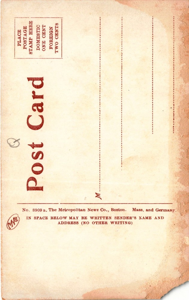 MAKE AN OFFER. THE MORE YOU BUY THE BETTER DEAL I WILL ACCEPT This postcard is from The Metropolitan News Co. in Boston, Massachusetts, and Germany. The front of the postcard provides instructions for postage rates, with one cent for domestic mail and two cents for foreign mail. The postcard features a space below for the sender's name and address to be written, with a prohibition against any other writing.The Metropolitan News Co.